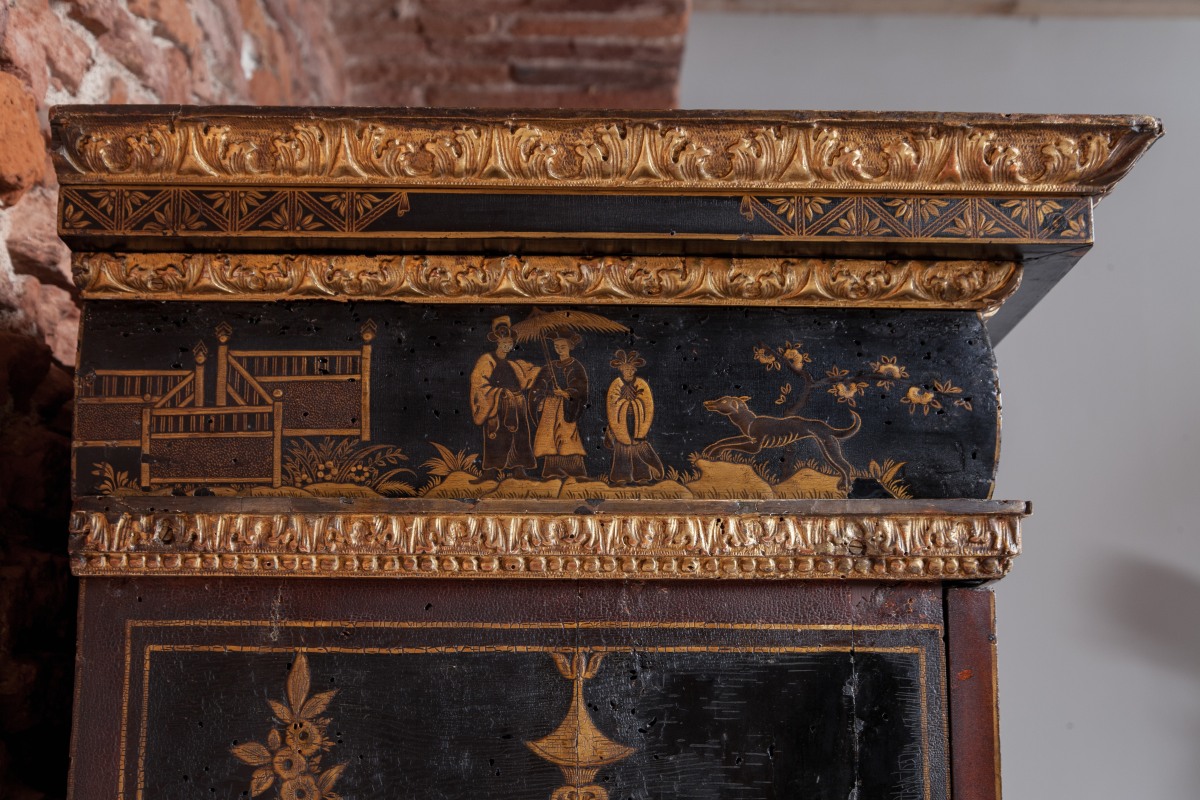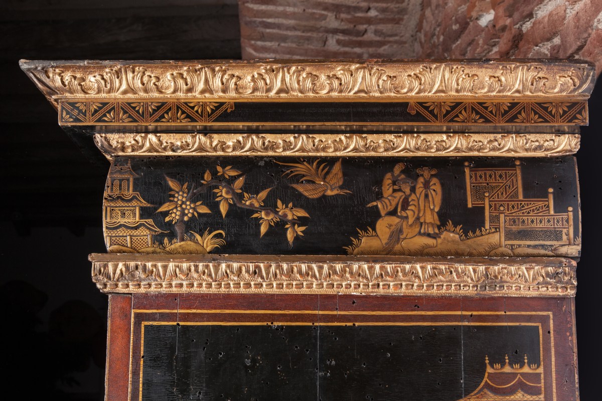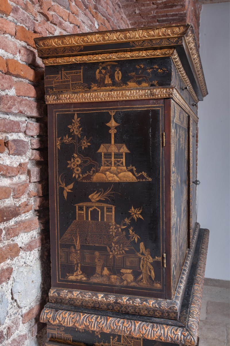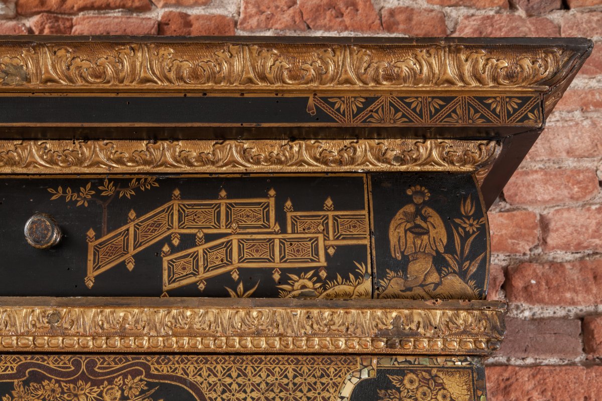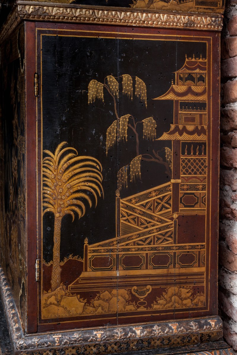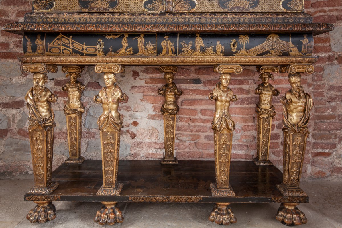Exceptional LAQUERED CABINET representing the fable of the Prince and the bird, and a series of exotic animals. The cabinet rests on a richly ornamented base with seven terms in sculpted and gilded wood. Parisian work of the time of Louis XIV, c. 1670-1680. Probably for the royal court of Portugal.