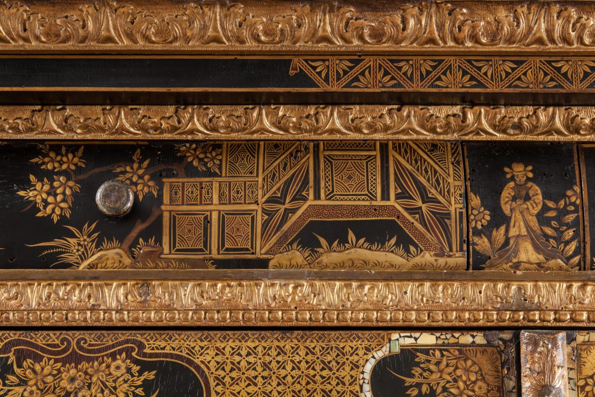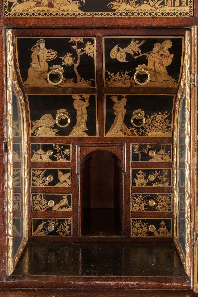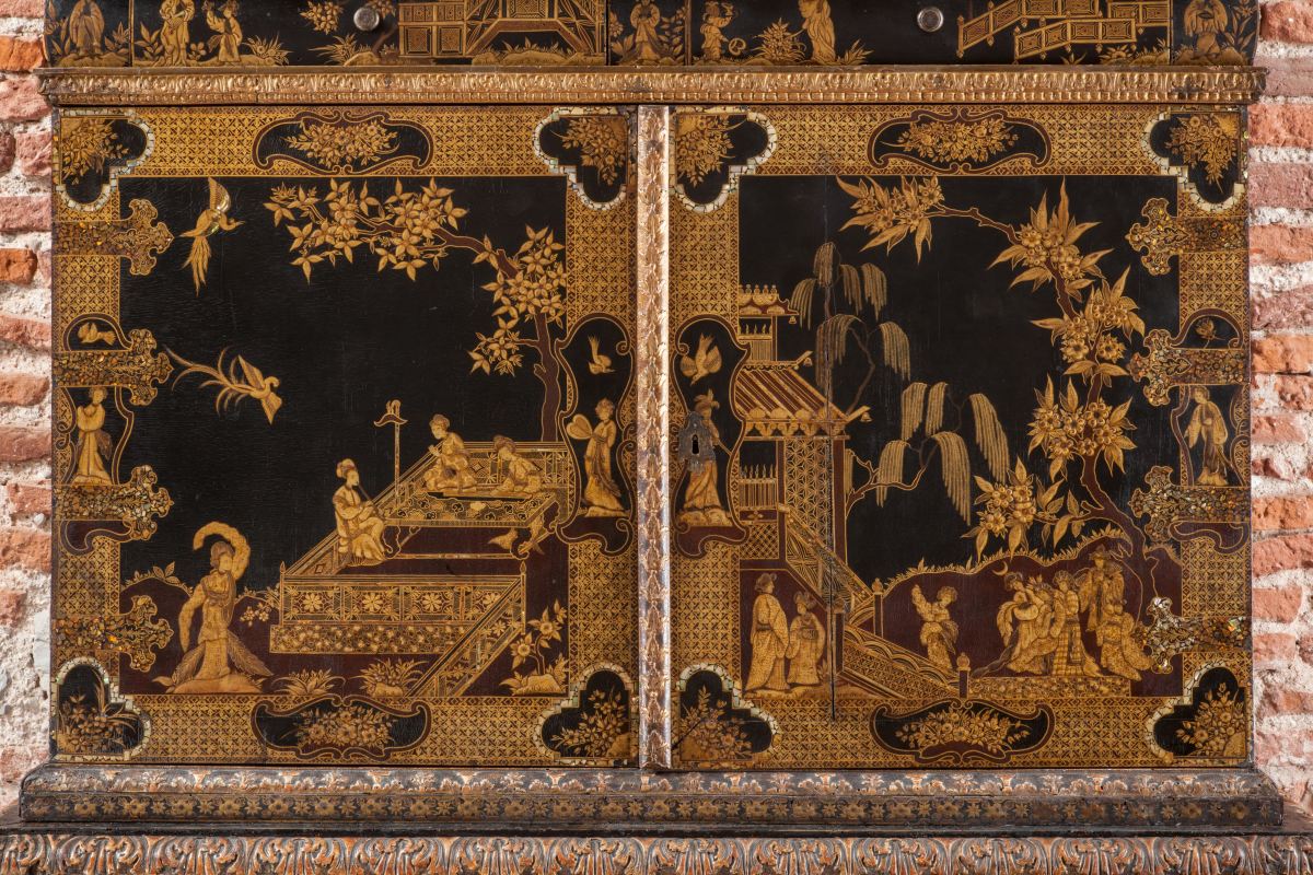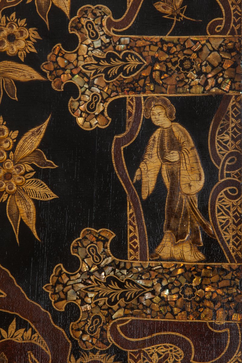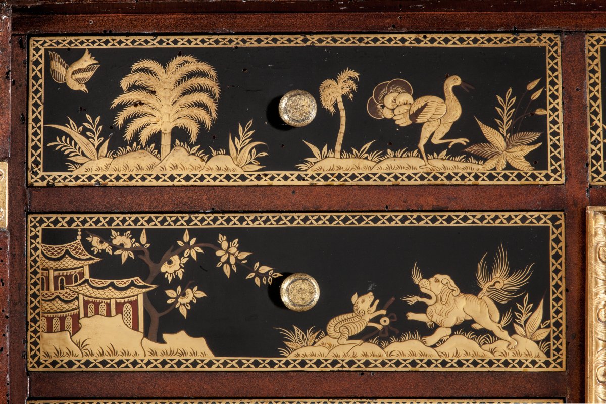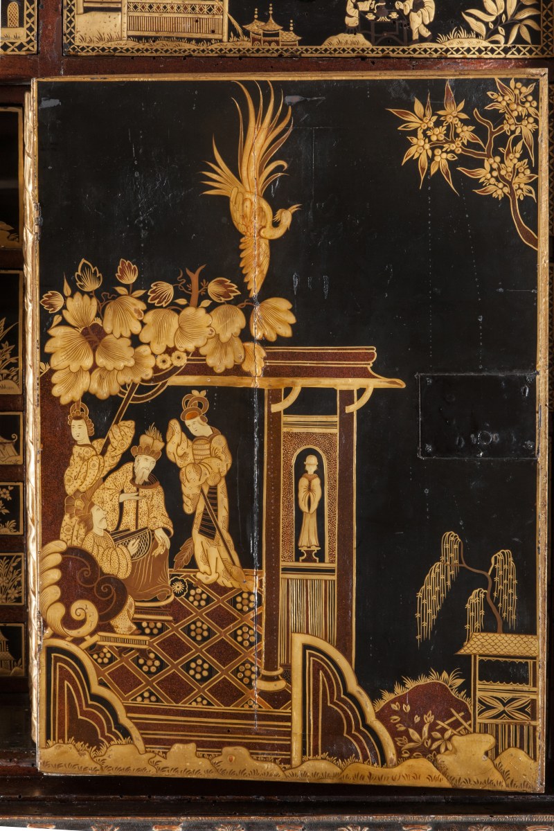 Grand CABINET EN LAQUE à motifs or sur fond noir, dans des encadrements " fond de poire " aventurine et marqueterie de nacre. Il ouvre en partie supérieure par deux tiroirs et deux vantaux illustrant à l'extérieur la fable taoïste du " Prince et de l'oiseau " avec danseurs, comédiens et musiciens et, à l'intérieur, une scène de chasse à courre et une scène de triomphe au char. Les vantaux dévoilent une façade de 11 tiroirs, représentant des animaux exotiques, entourant une petite porte poursuivant, à l'intérieur et l'extérieur, la fable, protégeant elle-même 12 tiroirs en doucine autour d'une niche. Bâti de bois résineux et façade plaquée en noyer en support du décor.