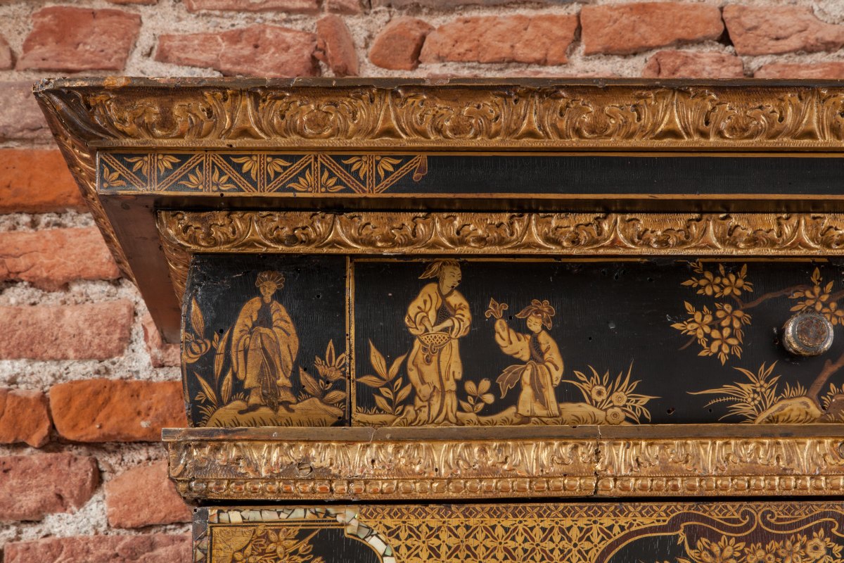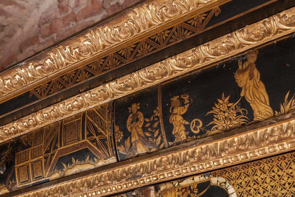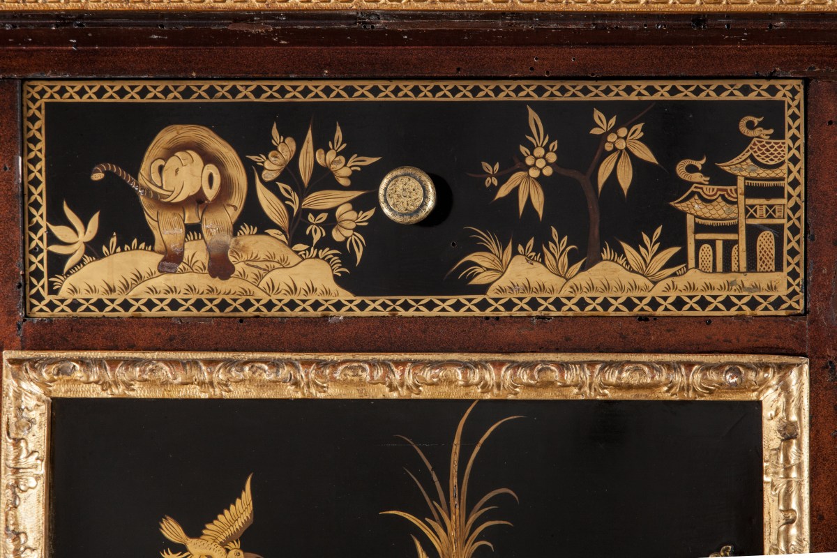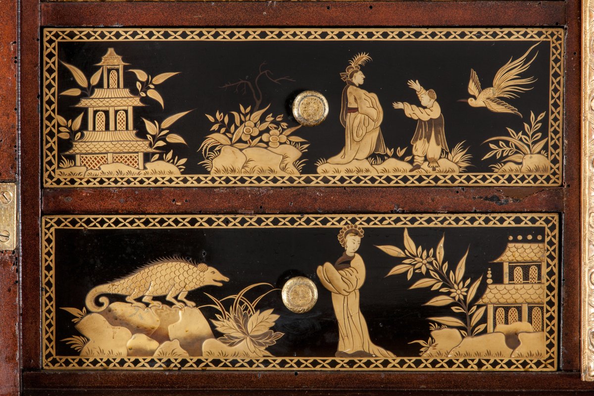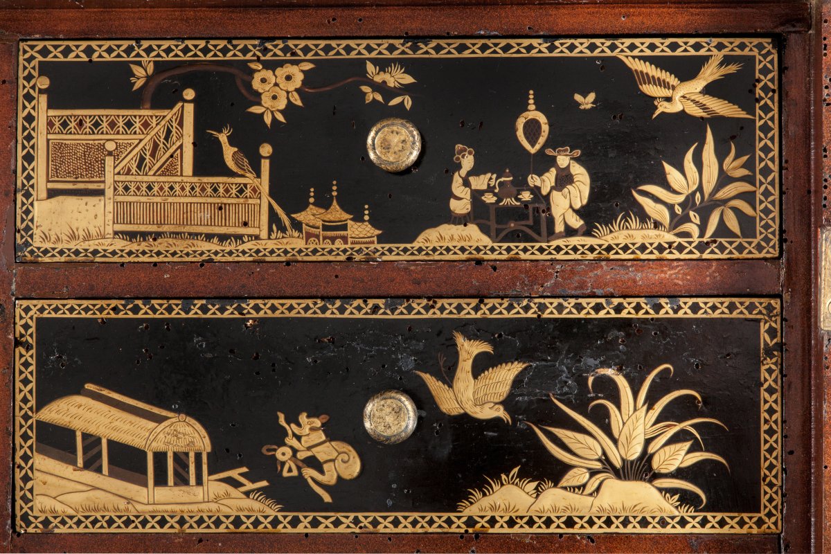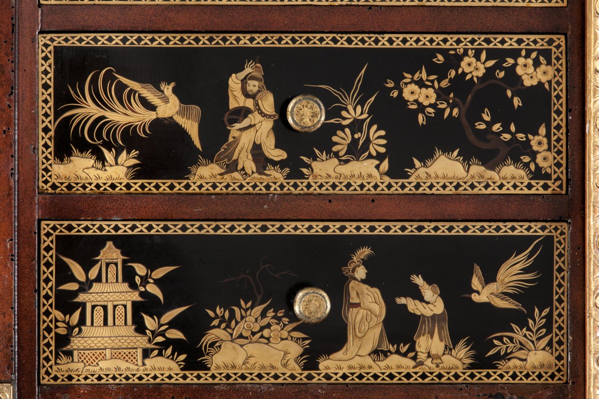 Grand CABINET EN LAQUE à motifs or sur fond noir, dans des encadrements " fond de poire " aventurine et marqueterie de nacre. Il ouvre en partie supérieure par deux tiroirs et deux vantaux illustrant à l'extérieur la fable taoïste du " Prince et de l'oiseau " avec danseurs, comédiens et musiciens et, à l'intérieur, une scène de chasse à courre et une scène de triomphe au char. Les vantaux dévoilent une façade de 11 tiroirs, représentant des animaux exotiques, entourant une petite porte poursuivant, à l'intérieur et l'extérieur, la fable, protégeant elle-même 12 tiroirs en doucine autour d'une niche. Bâti de bois résineux et façade plaquée en noyer en support du décor.