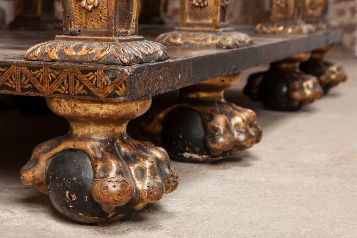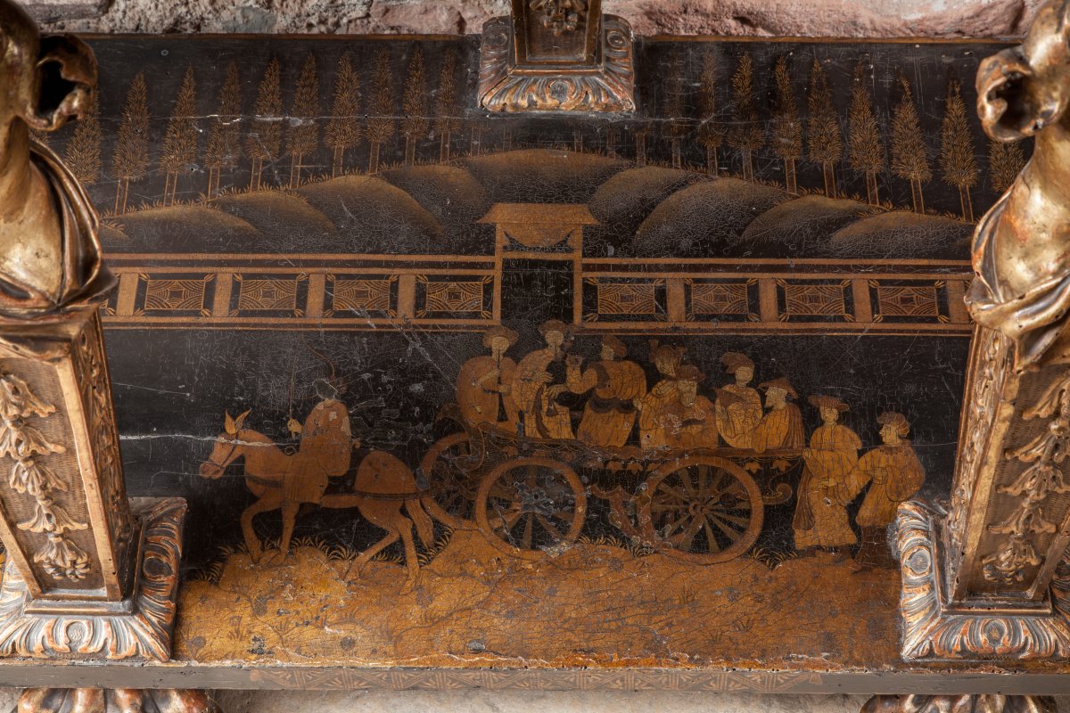 Sur un PIÈTEMENT en tilleul SCULPTÉ ET DORÉ à sept pieds figurant des termes masculins et féminins en gaines, surmontés par deux tiroirs à décor laqué, et réunis en partie basse par une tablette en bois vernis illustrant une promenade attelée dans un jardin, reposant sur sept pieds à pattes de lion terminés par des boules aplaties.