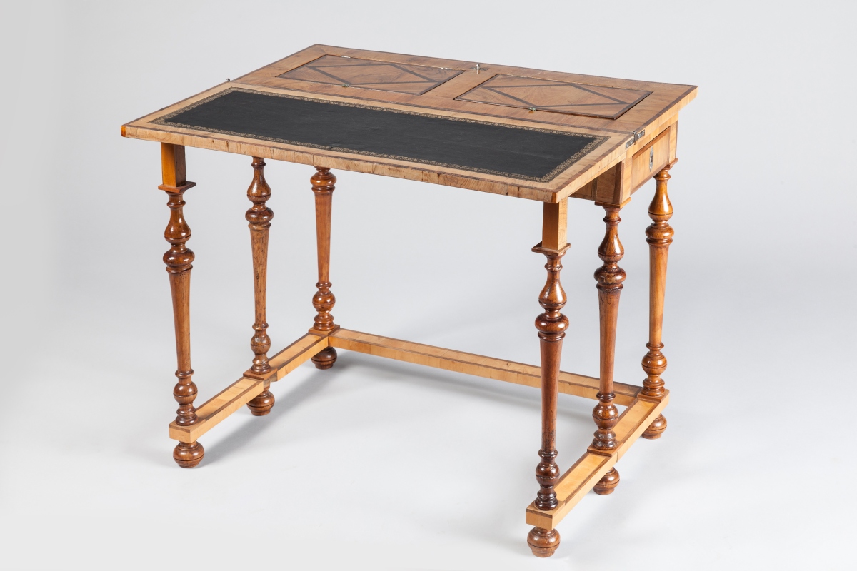 TABLE DE CHANGEUR de forme rectangulaire en noyer et marqueterie géométrique, le plateau ouvrant en deux parties, l'une foncée d'un cuir et l'autre contenant deux boitiers dont l'un pour une écritoire. Elle ouvre en ceinture par deux tiroirs latéraux fermant à clé et repose sur six pieds balustres réunis par une entrejambe, deux pieds pivotant pour supporter le plateau ouvert.