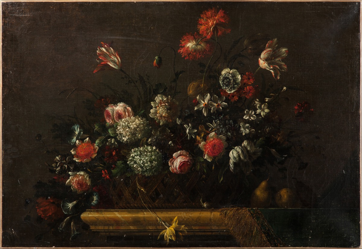 In the taste of MONNOYER. Basket of flowers on an entablature. Canvas.