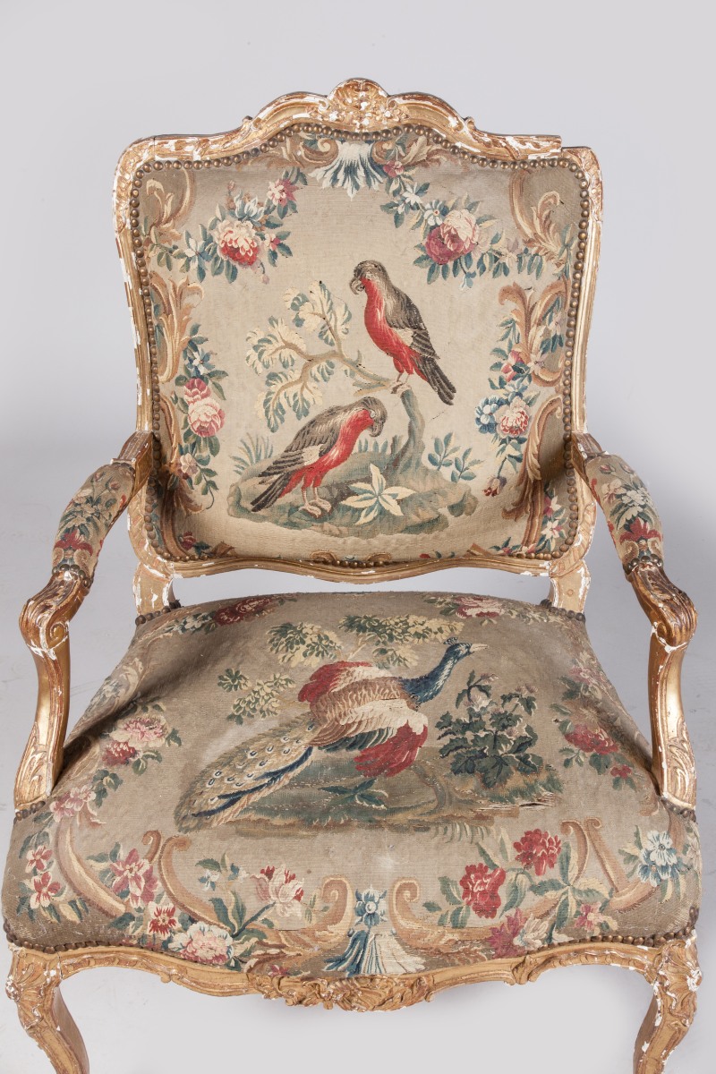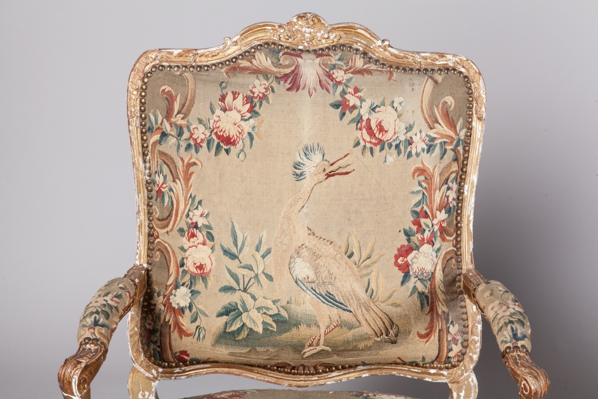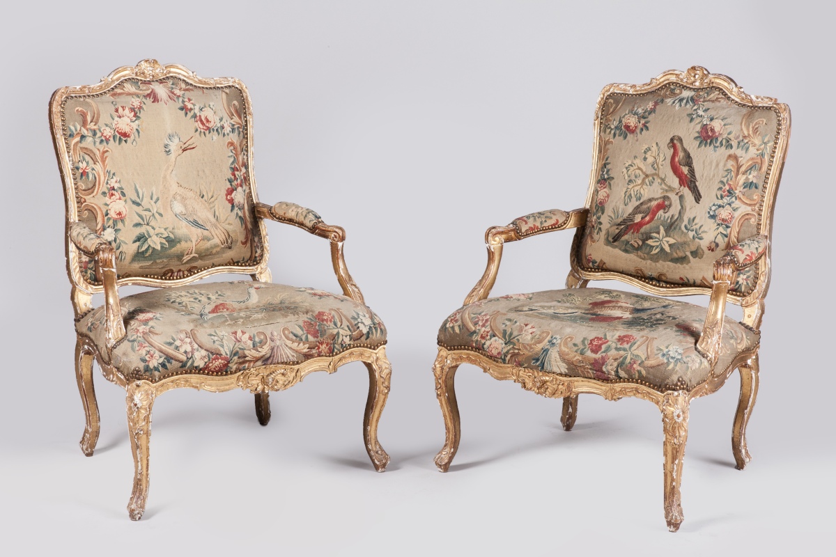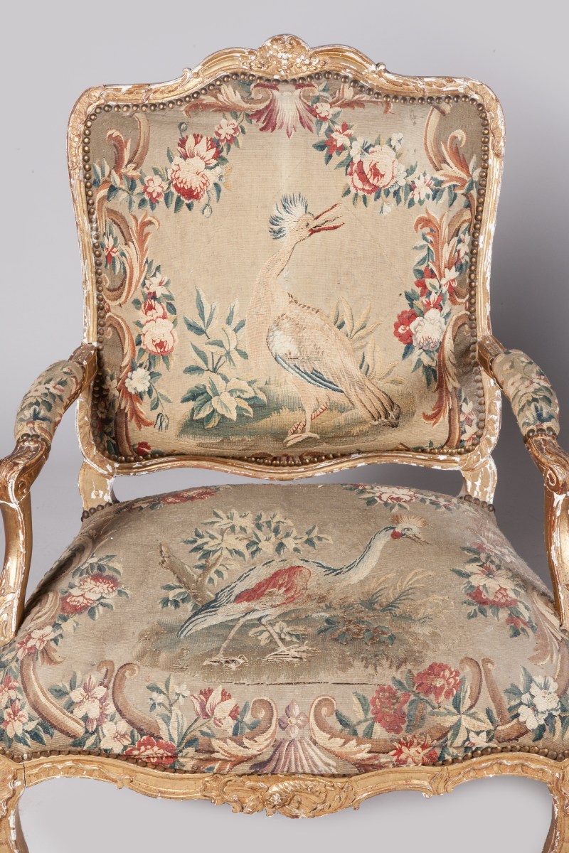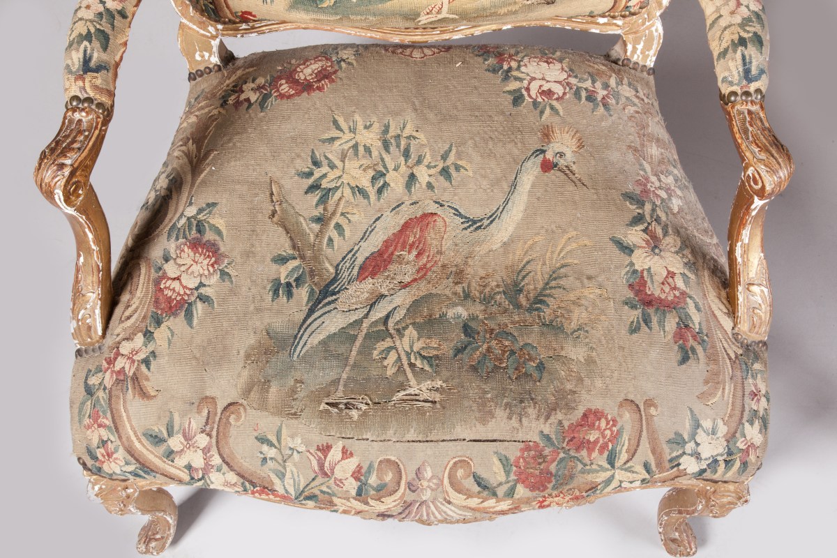 Dossiers et assises sont garnis en tapisserie d'Aubusson polychrome figurant des volatiles : un couple de perroquets et un paon pour l'un et un grèbe huppé et une grue pour l'autre.