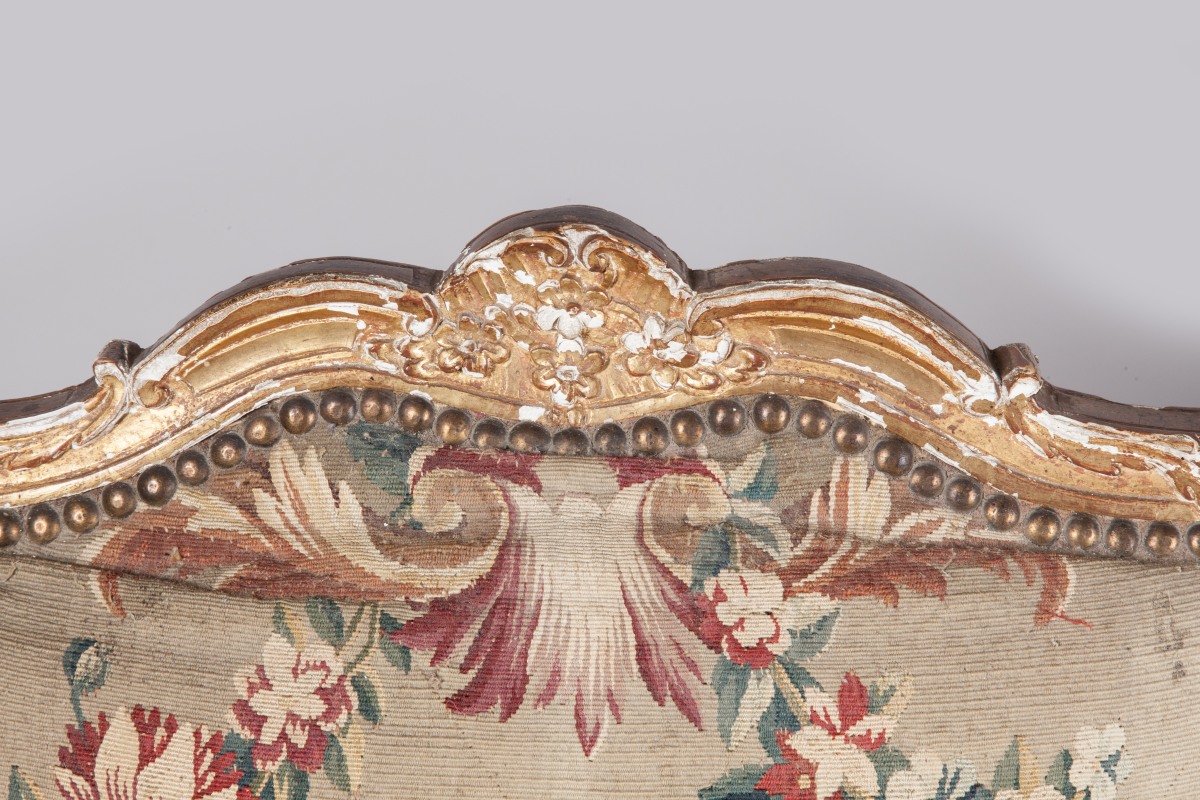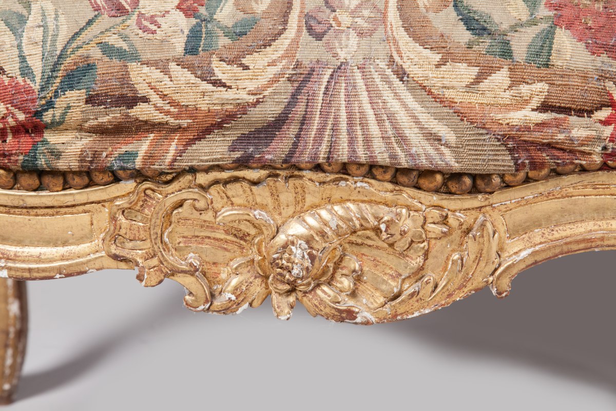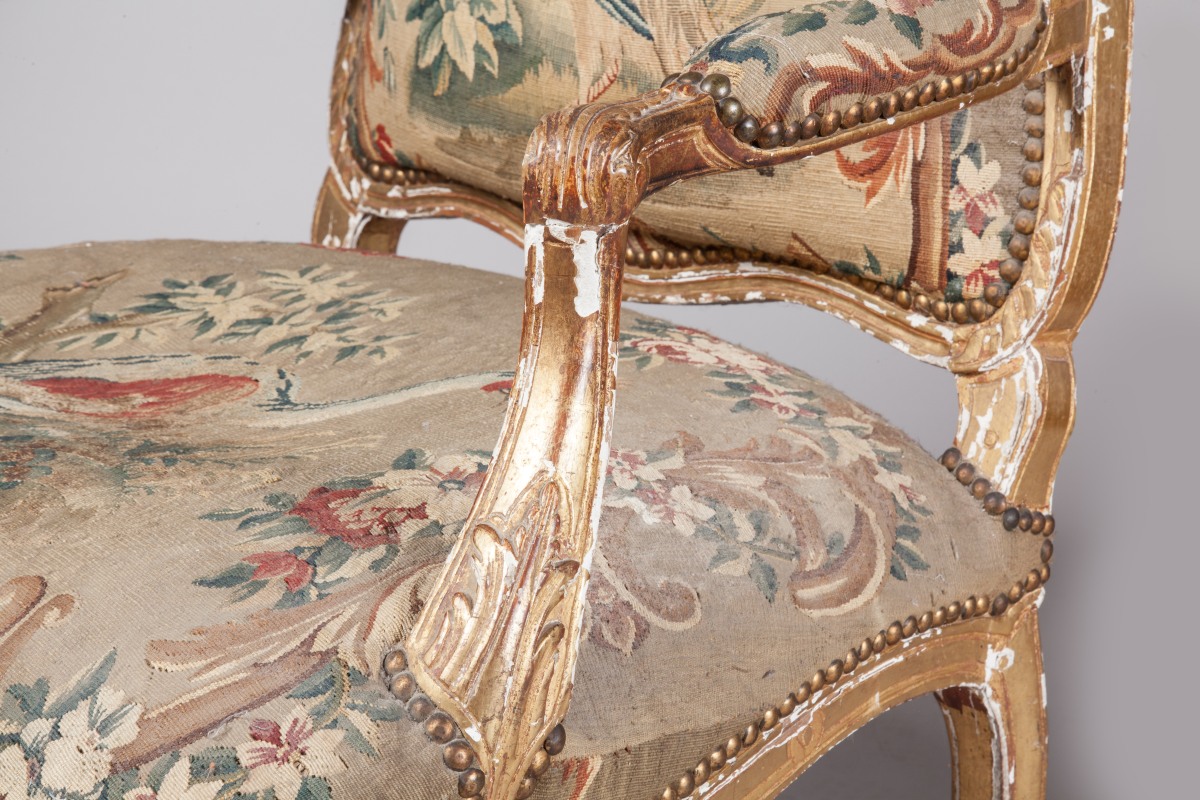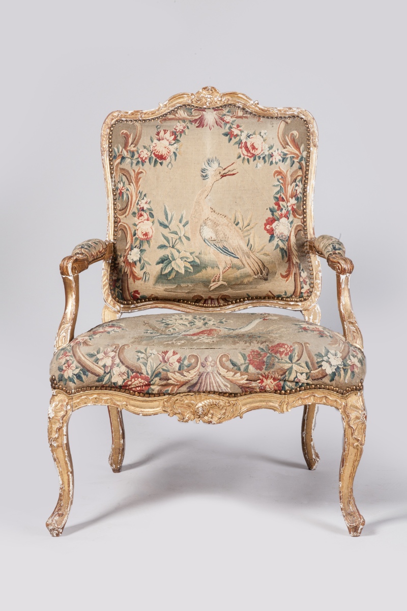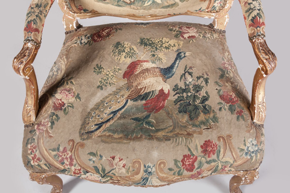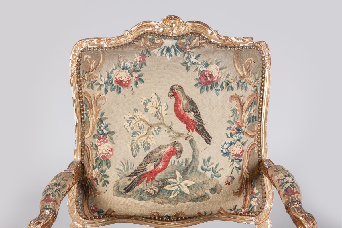 Dossiers et assises sont garnis en tapisserie d'Aubusson polychrome figurant des volatiles : un couple de perroquets et un paon pour l'un et un grèbe huppé et une grue pour l'autre.