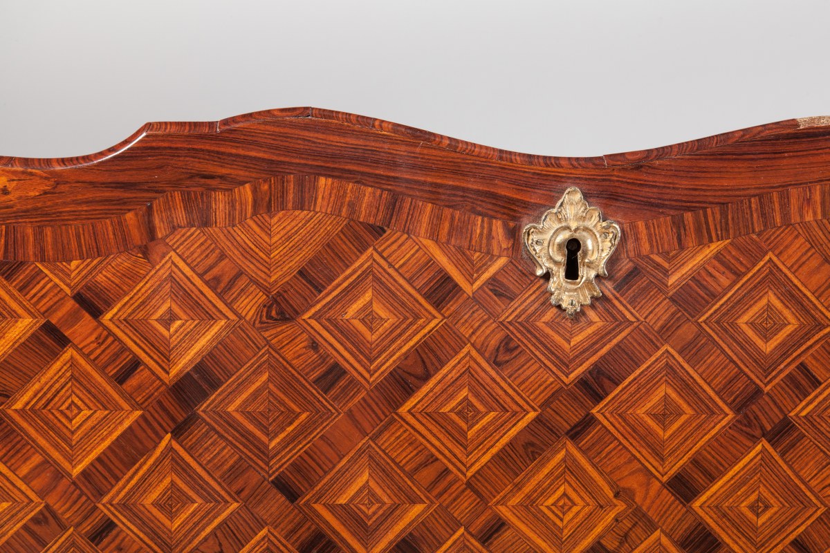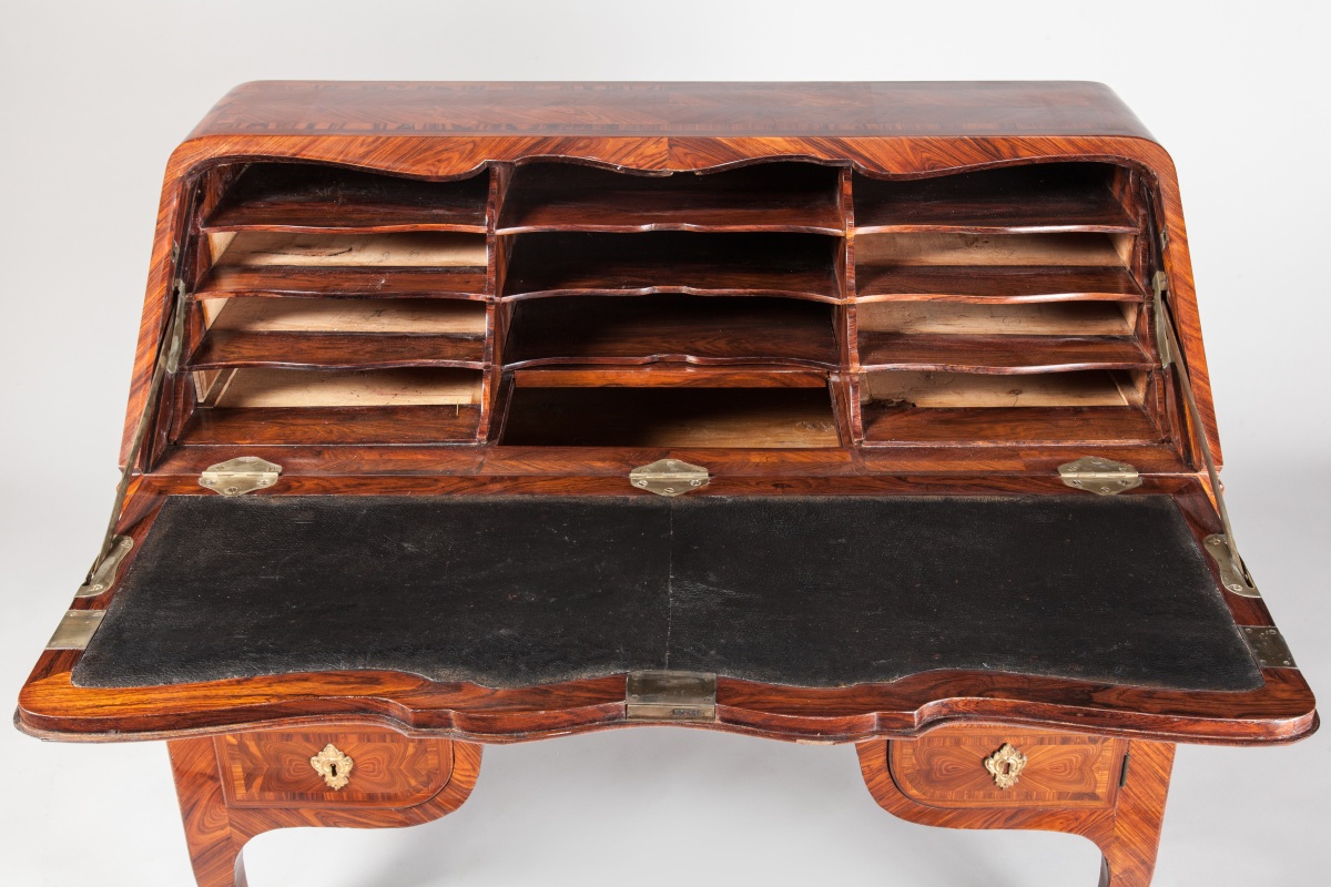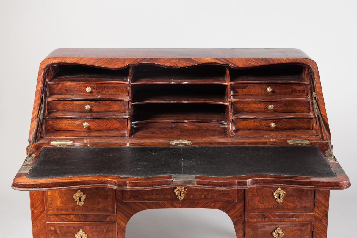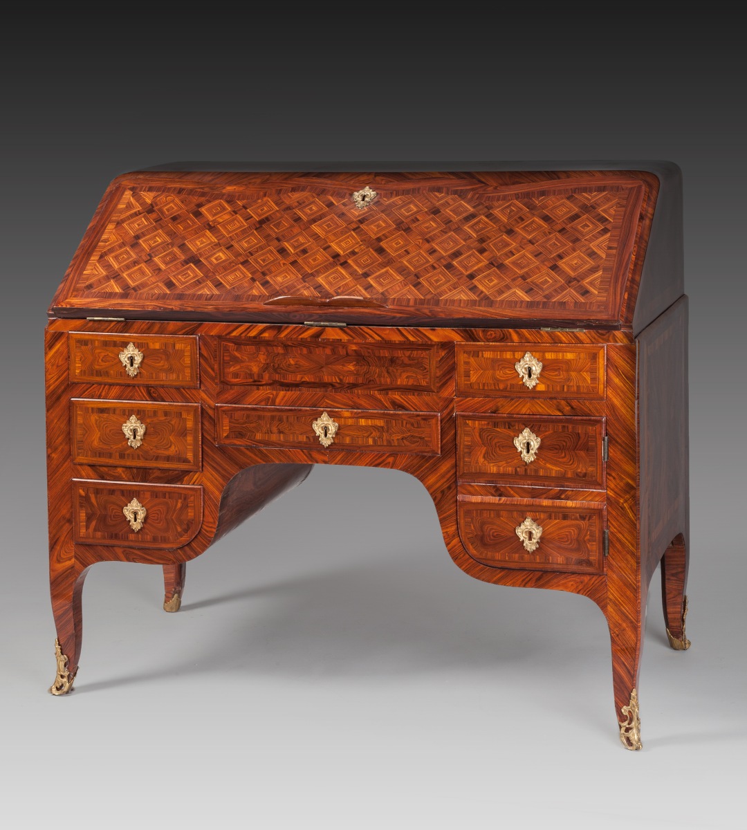 An important GRADIENT DESK attributed to MIGEON, with wooden crates, decorated by a trompe-l'oeil in marquetry dissimulating six drawers. Its façade presents seven drawers. Louis XV.