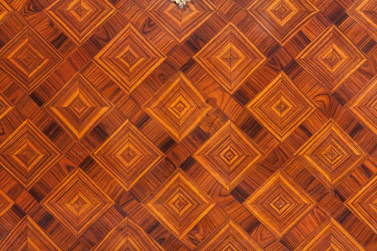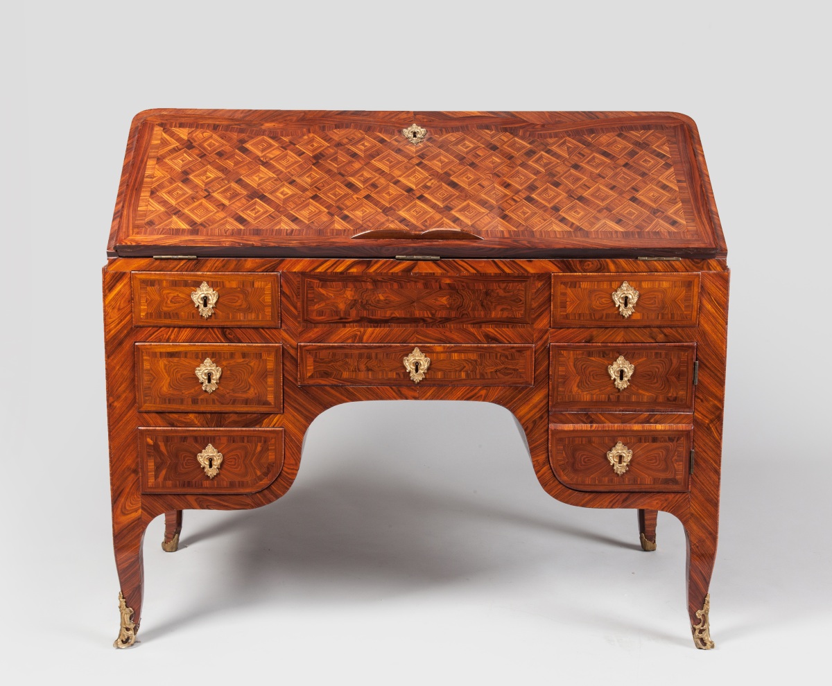 Grand BUREAU de PENTE à caissons en bois de placage toutes faces. Marqueterie de satiné, bois de rose et de violette, palissandre et bois d'amarante. Il ouvre par un abattant marqueté en jeu de carrés en trompe l'il dissimulant six tiroirs. La façade présente sept tiroirs.
