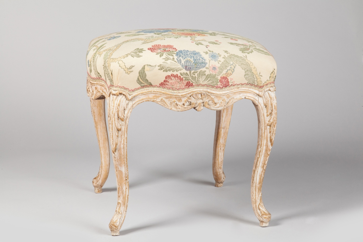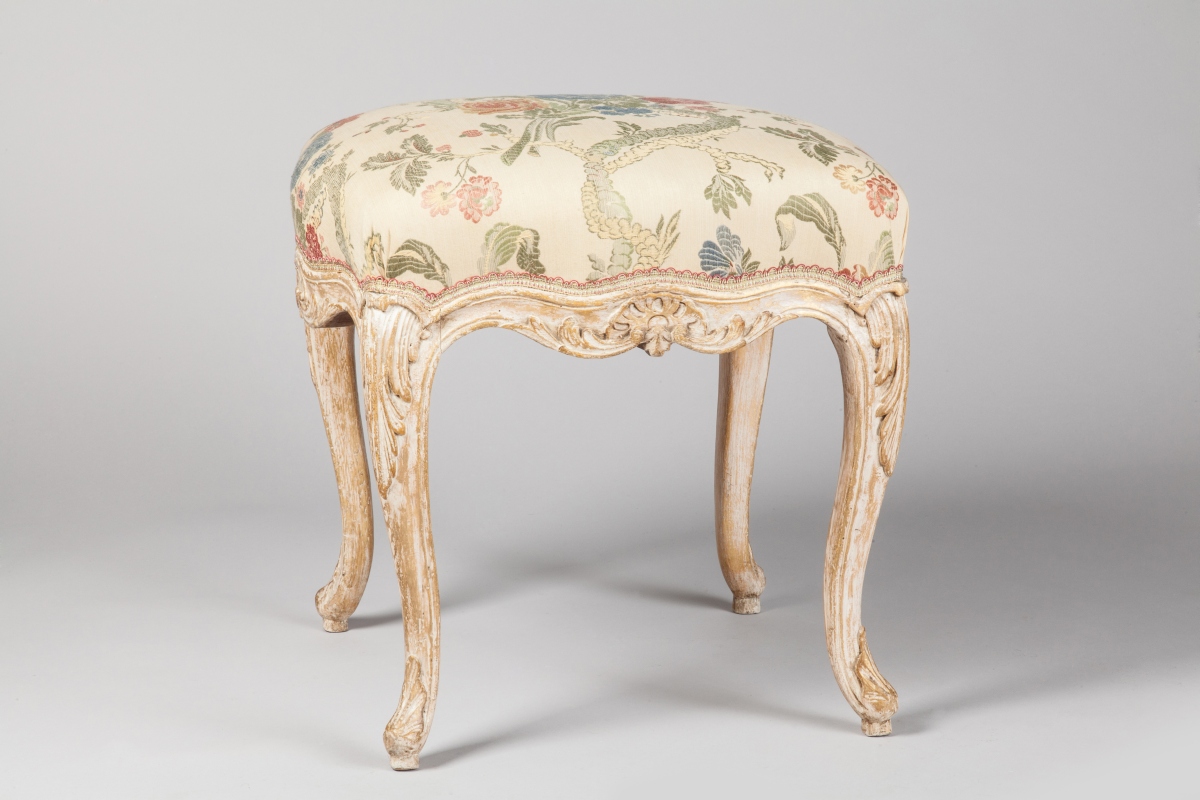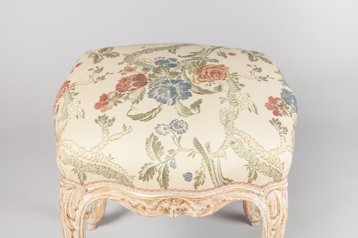 TABOURET carré relaqué crème et patiné or, en bois naturel mouluré et sculpté de coquilles, feuilles d'acanthe. Ceinture mouvementée, il repose sur quatre pieds cambrés.