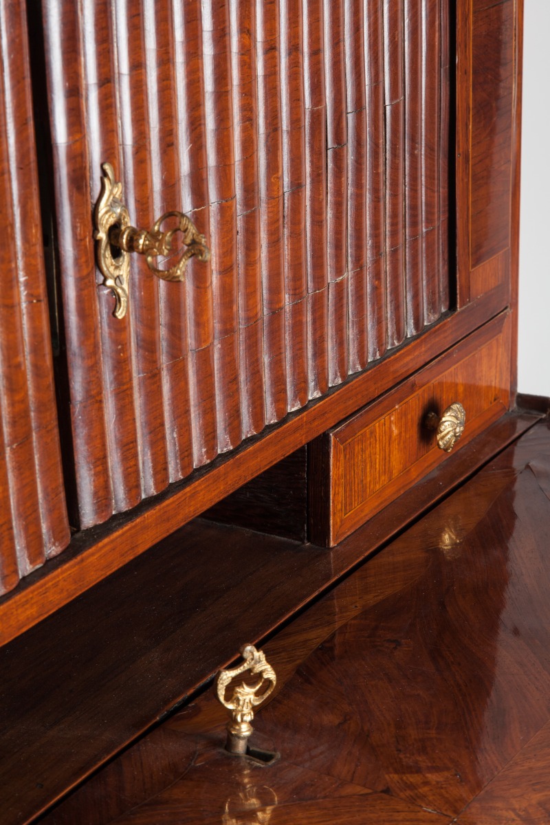BONHEUR du JOUR en bois de placage et marqueterie toutes faces, en satiné et bois de rose. Il présente un gradin à portes à rideaux coulissants, reposant sur deux tiroirs et une niche. Il ouvre à un abattant dissimulant un plateau coulissant encadré de deux caissons. Deux petits tiroirs en façade. Piètement galbé.