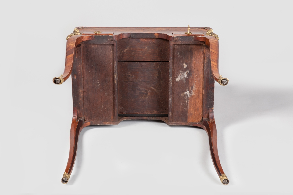A BONHEUR DU JOUR worked in marquetry. It opens with a flap that dissimulates a plateau. Two small drawers in the front. Louis XV. Ornamented with chiseled and gilded bronzes.