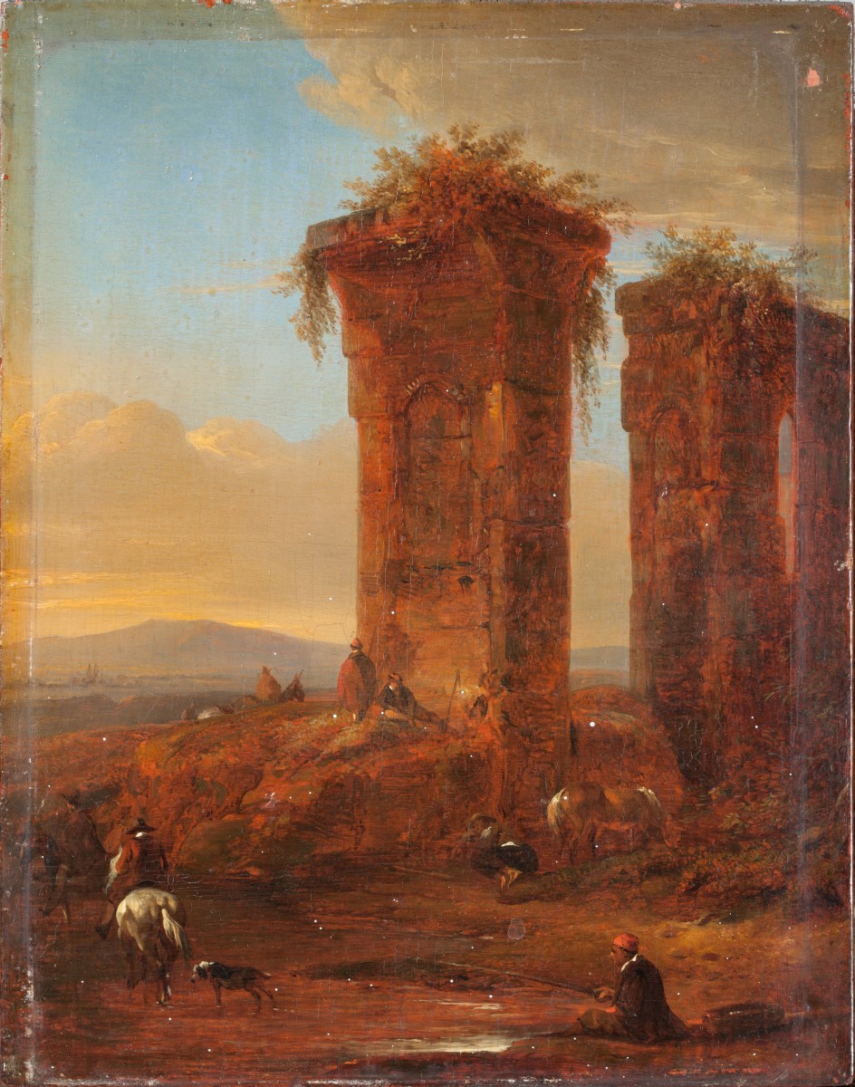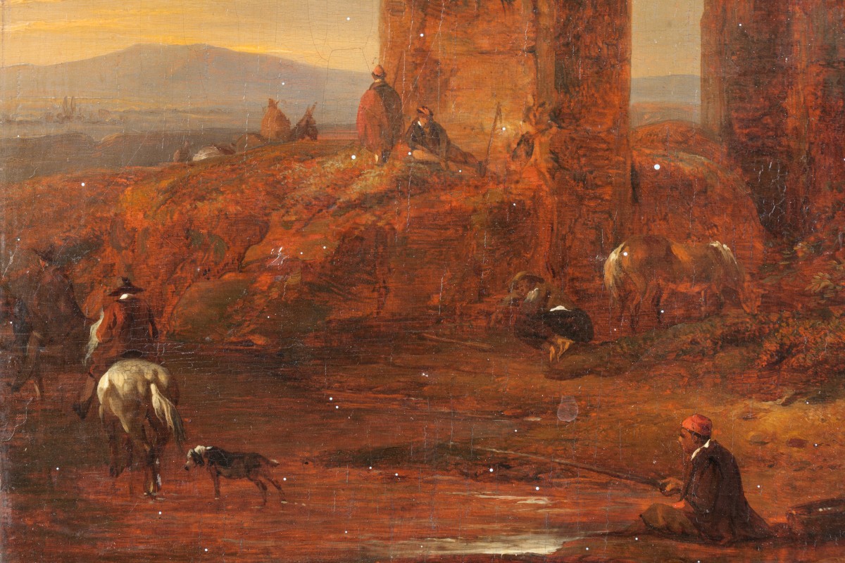 Cavaliers et pêcheurs dans un paysage de ruines.