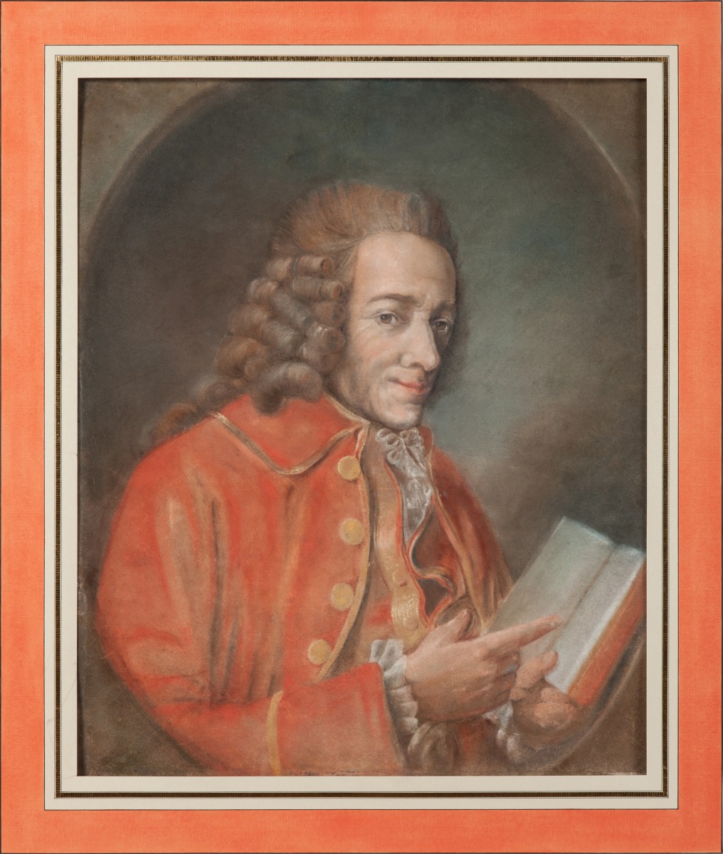 Pierre-Martin BARAT. Portrait of Voltaire. Pastel. In an exceptional sculpted and gilded Louis XV frame.