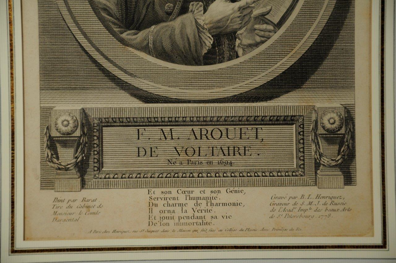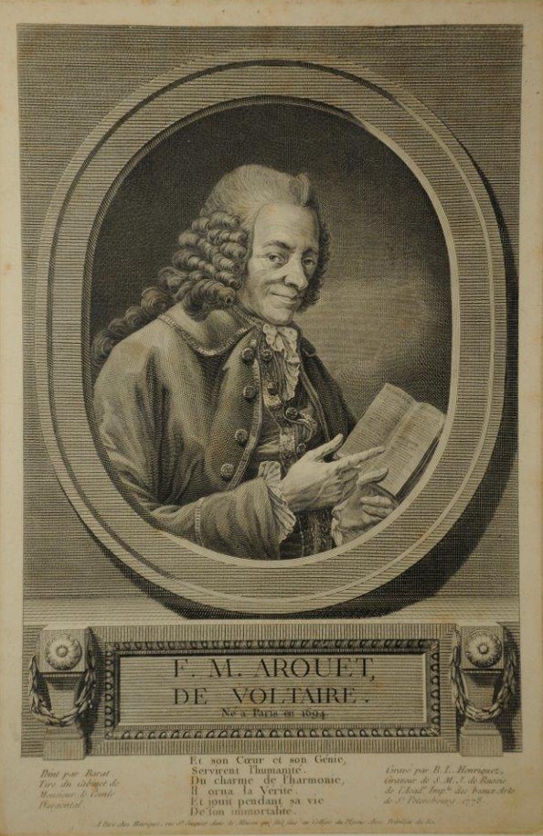 Pierre-Martin BARAT, portraitiste en activité au XVIIIe siècle, fut notamment peintre de la ville de Nîmes. Il fait ainsi une représentation de Louis XVI pour la salle du conseil de l'Hôtel de ville de Nîmes. Il se rendit célèbre en exécutant ce portrait de Voltaire et d'acteurs de son temps. Dans une lettre à Catherine II du 28 juin 1775, Voltaire lui parle de ce portrait et loue le talent de Barat : le peintre a "l'art de faire parfaite ressemblance". Ce portrait a été gravé par B.-L. HENRIQUEZ. La gravure est jointe.