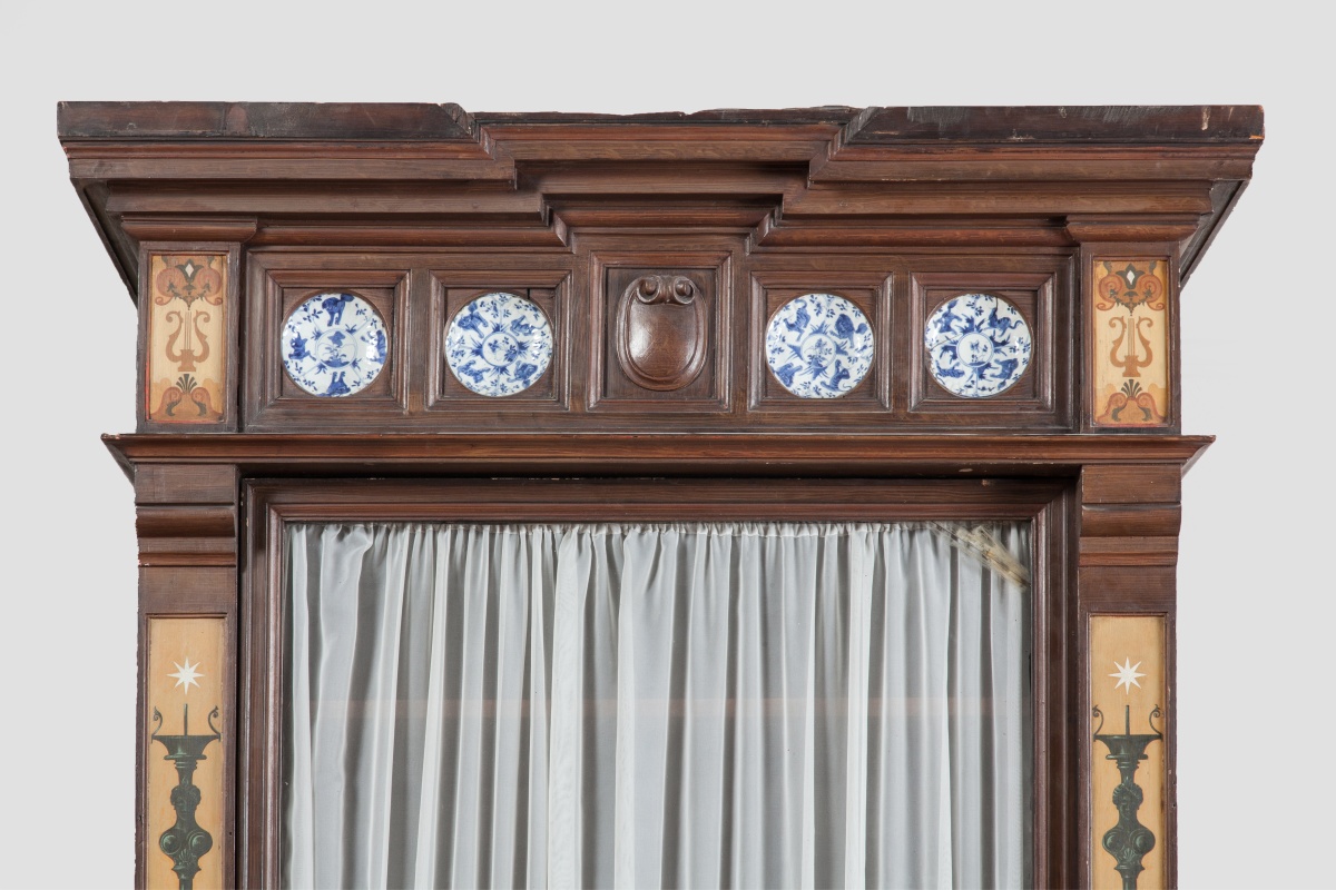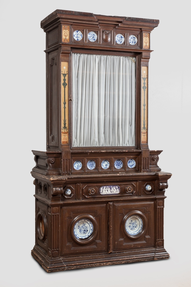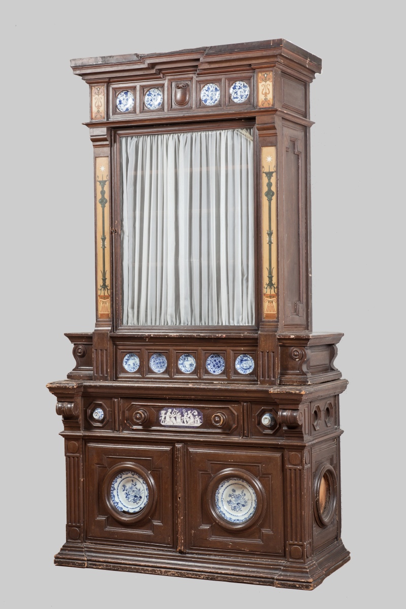 Painted wood BUFFET with porcelain dishes. Second half of the 19th century. Former property of Victor Hugo at his parisian office of the Comité de secours pour les Israélites de Russie.