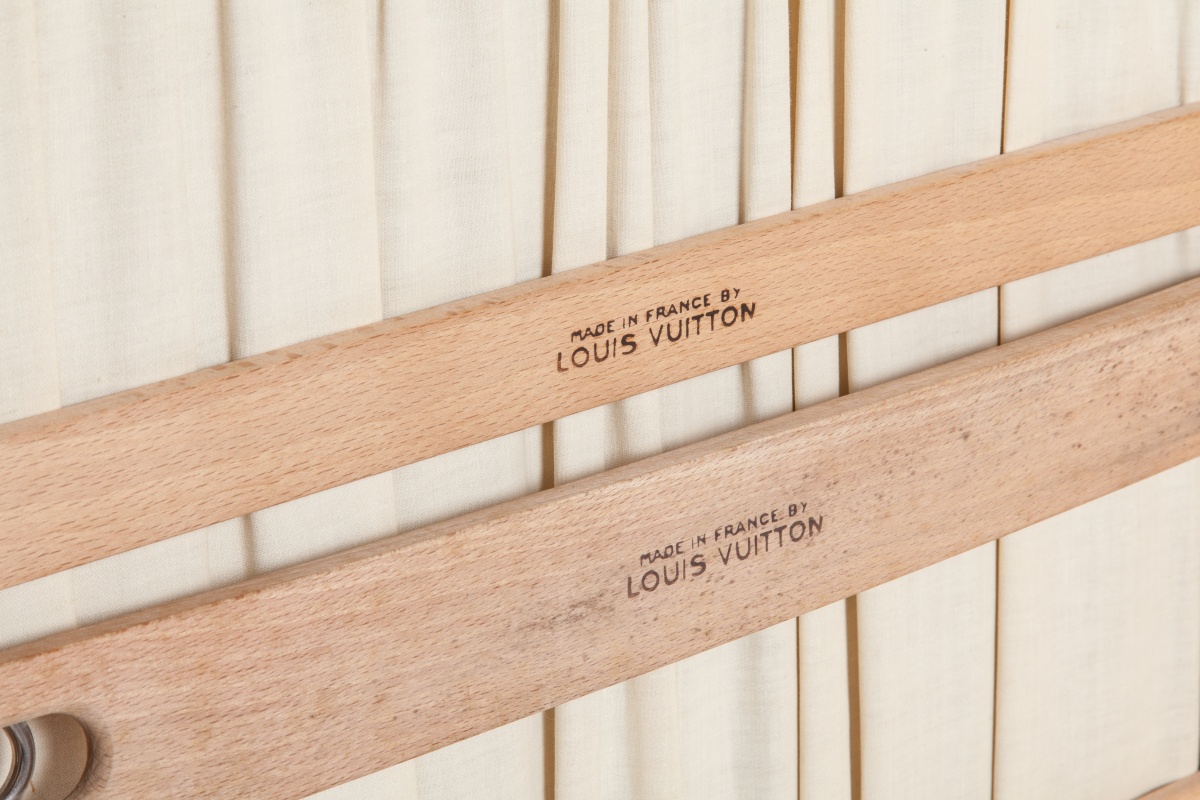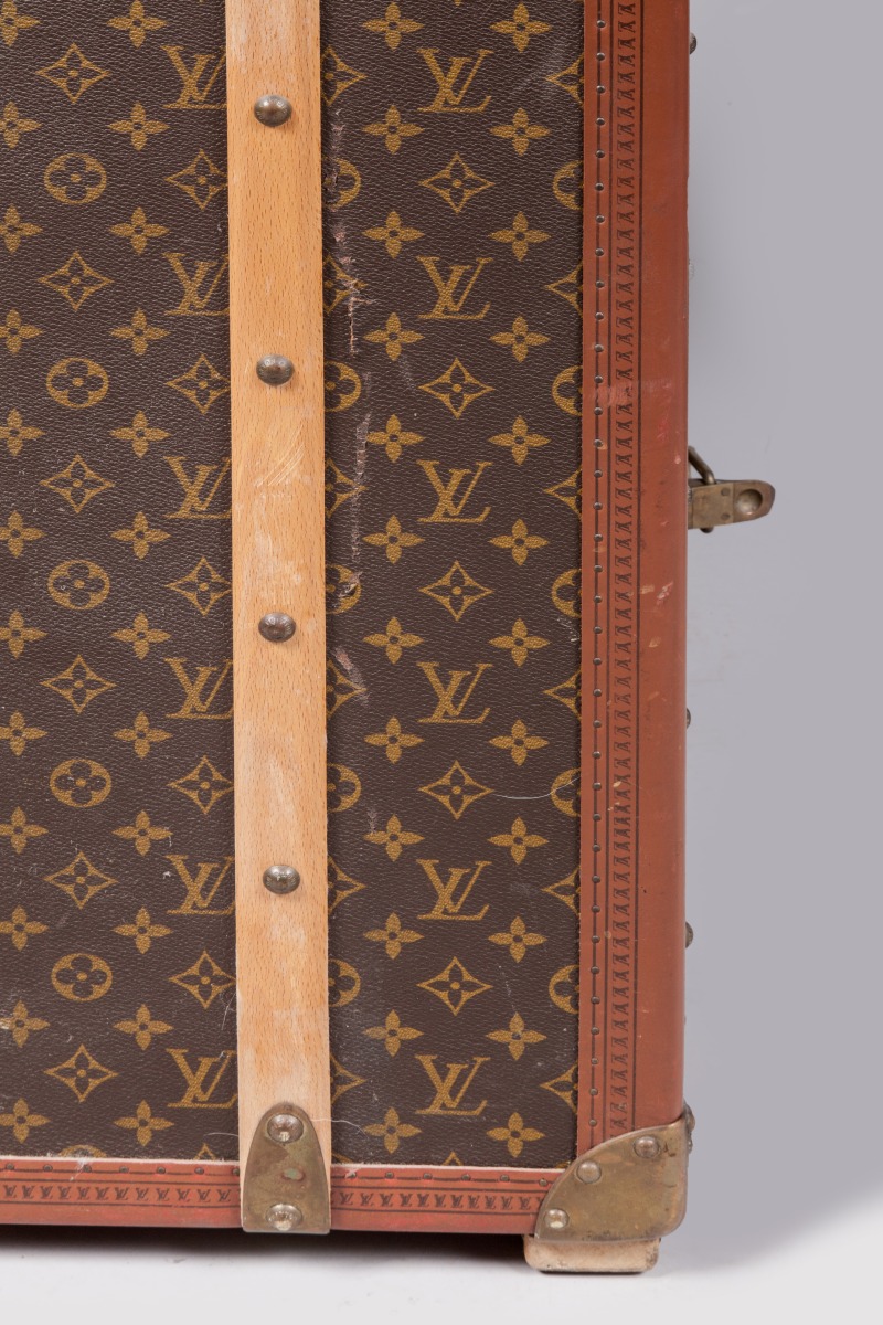 WARDROBE en toile monogrammée et renforts en hêtre. Bordures lozinées, écoinçons et fermetures en laiton doré. Poignées en cuir. Intérieur doublé de vuittonite beige ouvrant d'un côté à sept tiroirs et formant penderie munie d'une mallette à chaussures amovible de l'autre. Ouverture par le dessus.
