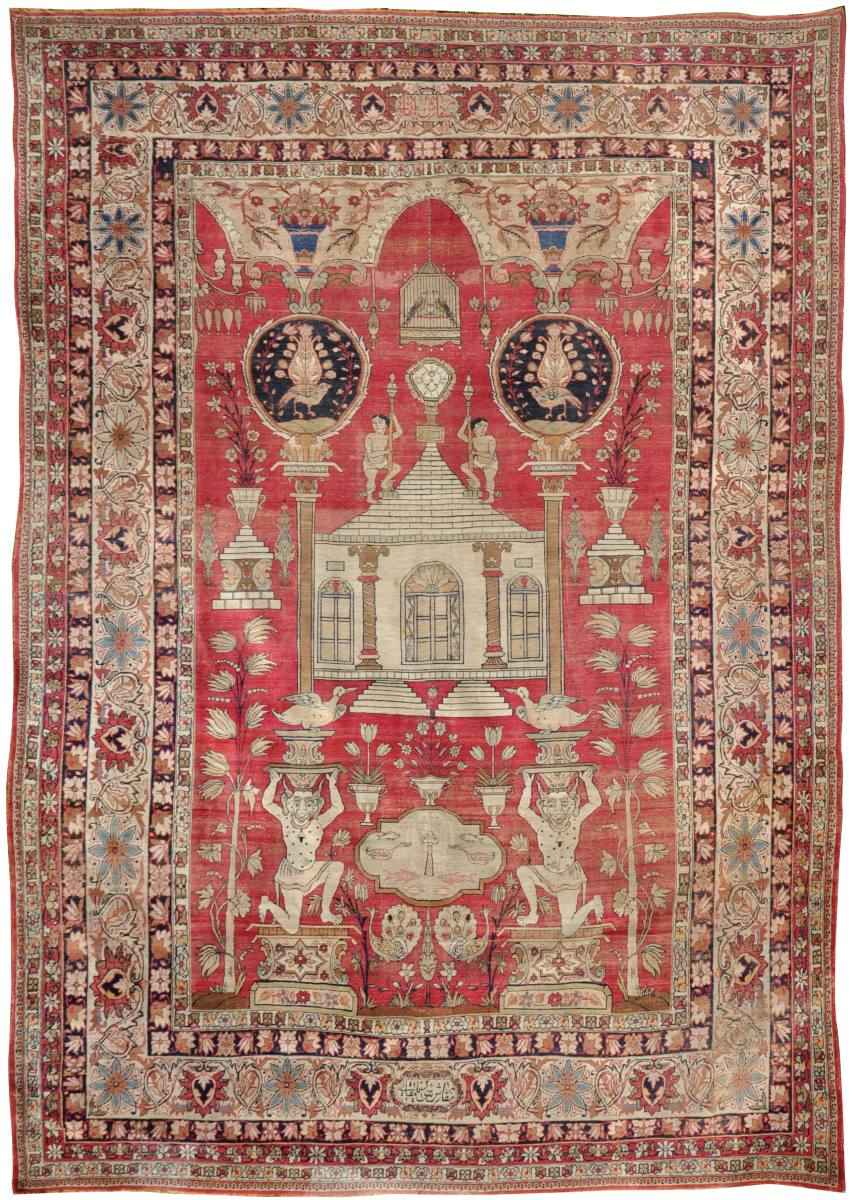 PERSIA. Rare GASHKAI CARPET in wool with red background. It represents a tree of life in a garden with two divinities with monstrous faces holding a column upon which a duck and a bird of paradise are seated. Written "ordered for Hassan Ya Maghani in the year 1281" (1903). From the collection of French moviemaker René Clément, Monaco.
