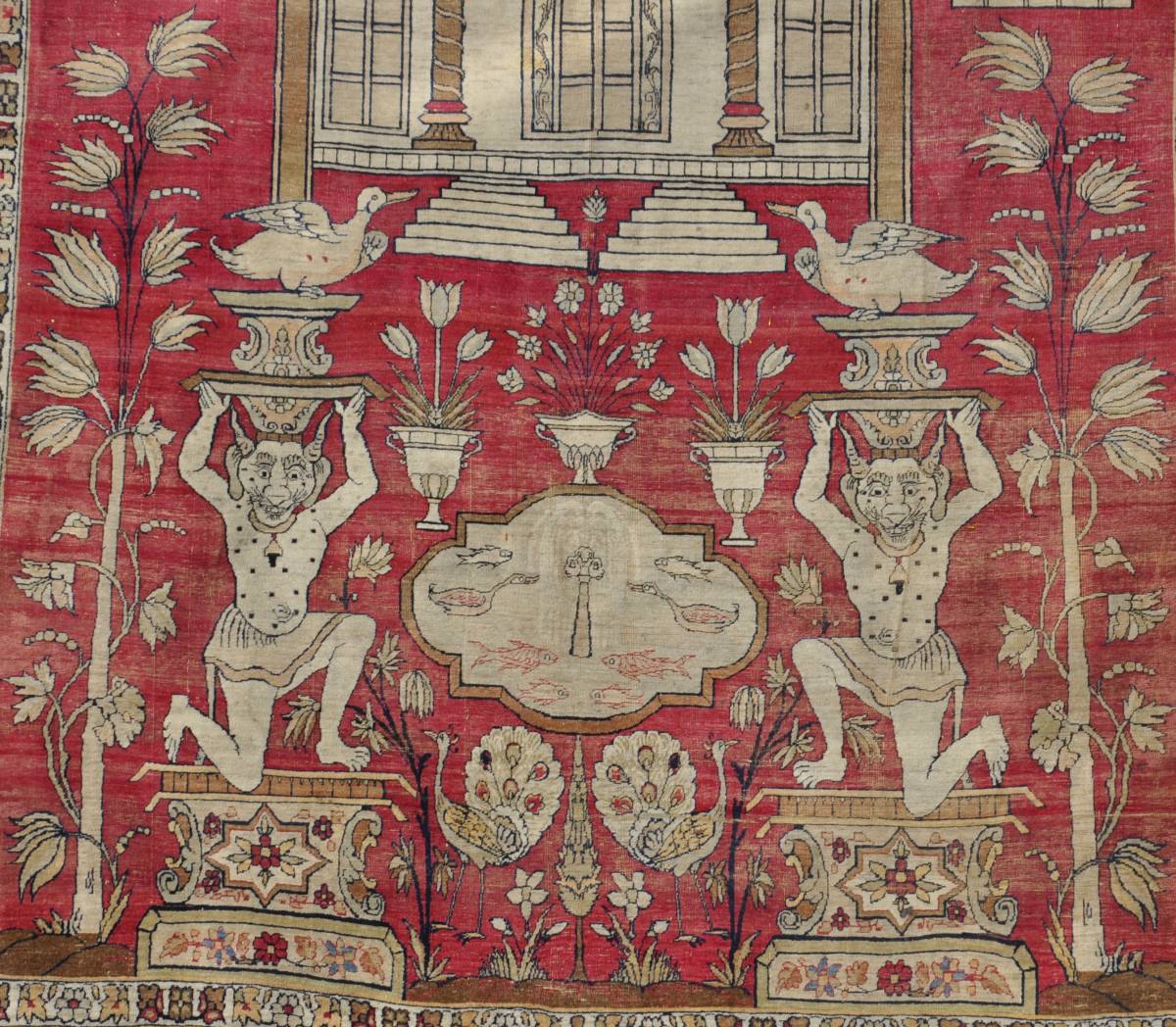 Il présente un arbre de vie dans un jardin, un riche décor symétrique de deux hommes à tête monstrueuse soutenant une colonne sur laquelle se tiennent un canard, et un oiseau de paradis à l'amortissement.