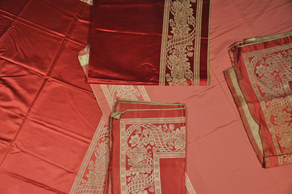Réunion de CINQ LAIZES de LAMPAS, fond satin rouge ou rose, bordure crème effet argent de guirlande de fleurs.