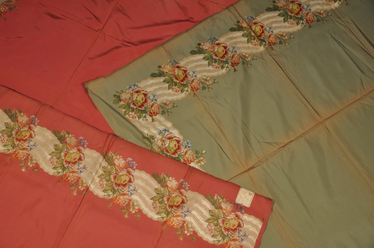 Réunion de TROIS LAIZES de LAMPAS, fond gros de Tours rouge ou vert, bordure brochée polychrome de rubans et fleurs.