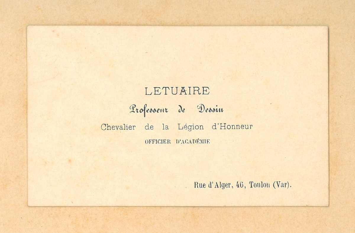 JOINT : Carte de visite de Pierre Letuaire : "Professeur de Dessin / Chevalier de la Légion d'Honneur / Officier d'Académie / Rue d'Alger, 46, Toulon (Var)."