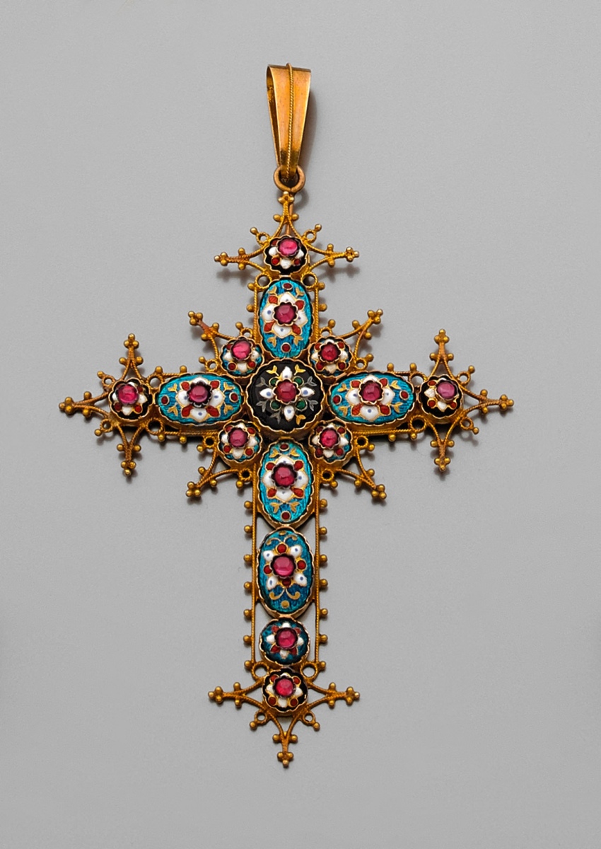 PENDENTIF CROIX en or jaune 18K 750 millièmes ajouré, orné de motifs à décor floral en ÉMAUX bressans, serti de pierres fines de forme cabochon, la monture décorée de petites boules d'or. (Petits manques à l'émail, deux pointes légèrement faussées).