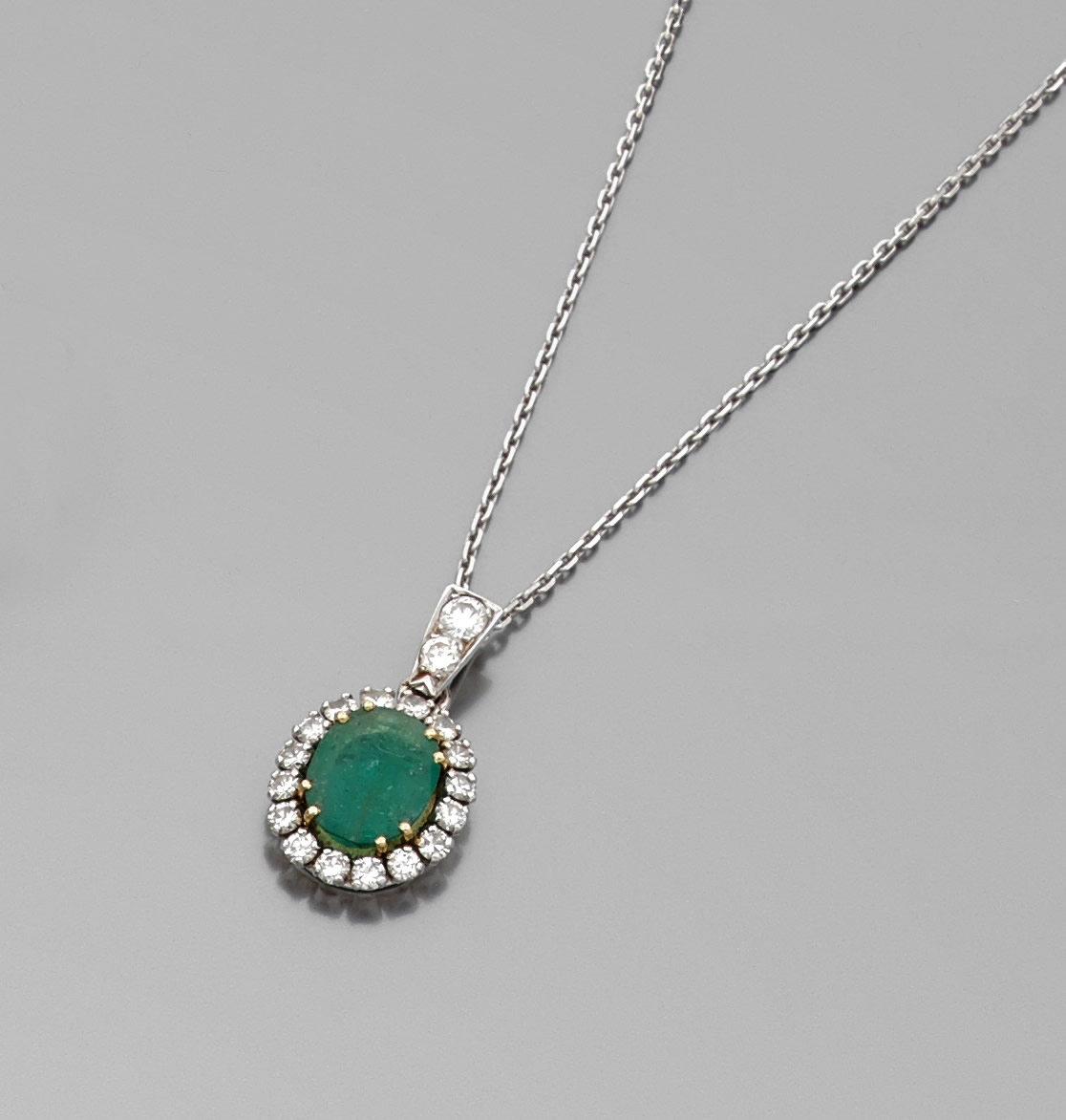 COLLIER articulé en or gris 18K 750 millièmes, retenant en pendentif une ÉMERAUDE de forme ovale dans un entourage de DIAMANTS ronds de taille brillant.