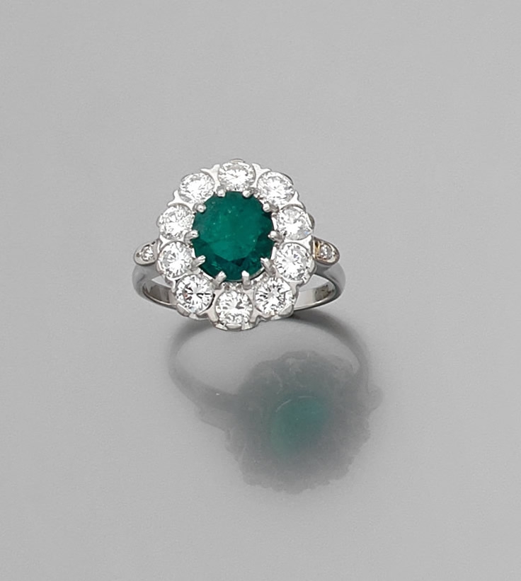 Grey gold RING set with an oval-shaped emerald and ten round diamonds.