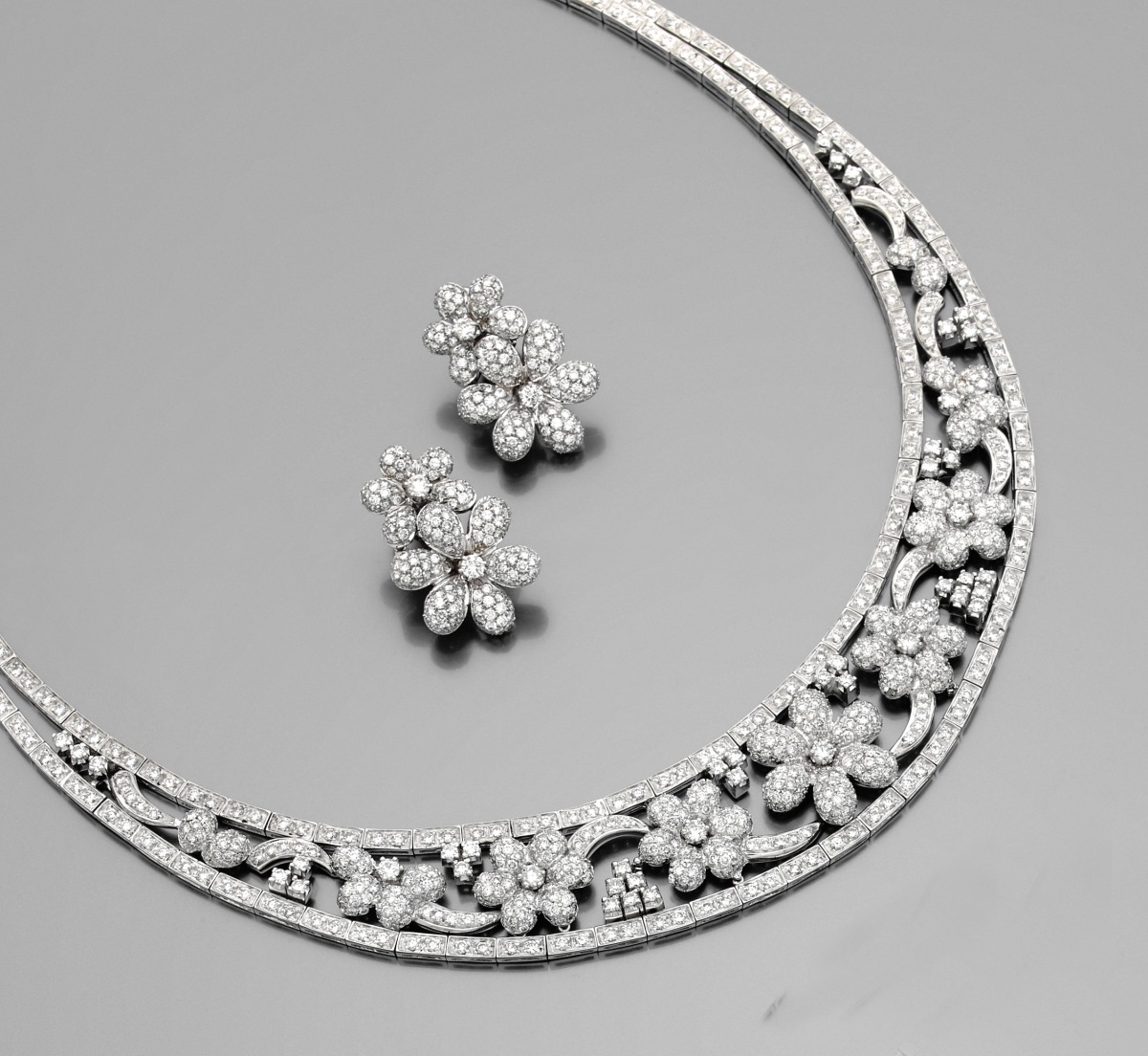 COLLIER articulé formant draperie et paire de boucles d'oreilles (système pour oreilles percées), en or gris 18K 750 millièmes à motifs de fleurs entièrement pavés de DIAMANTS ronds de taille brillant, ceux formant les pistils plus importants.
