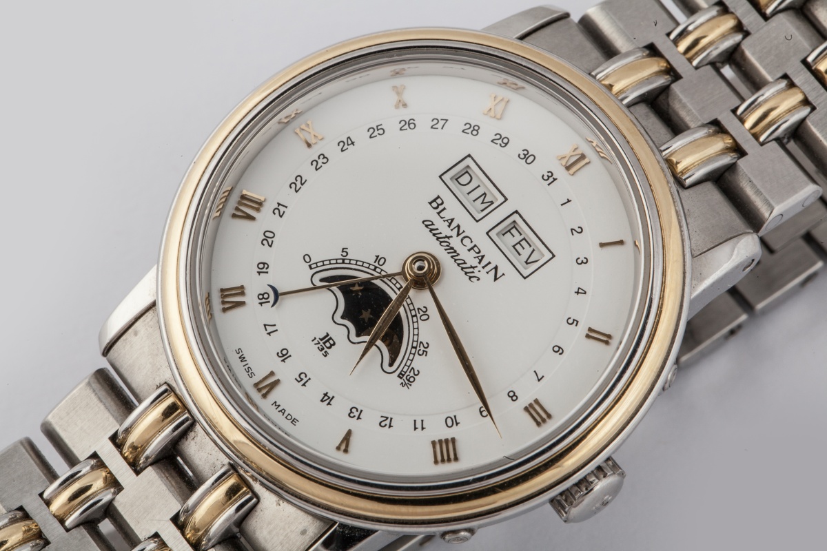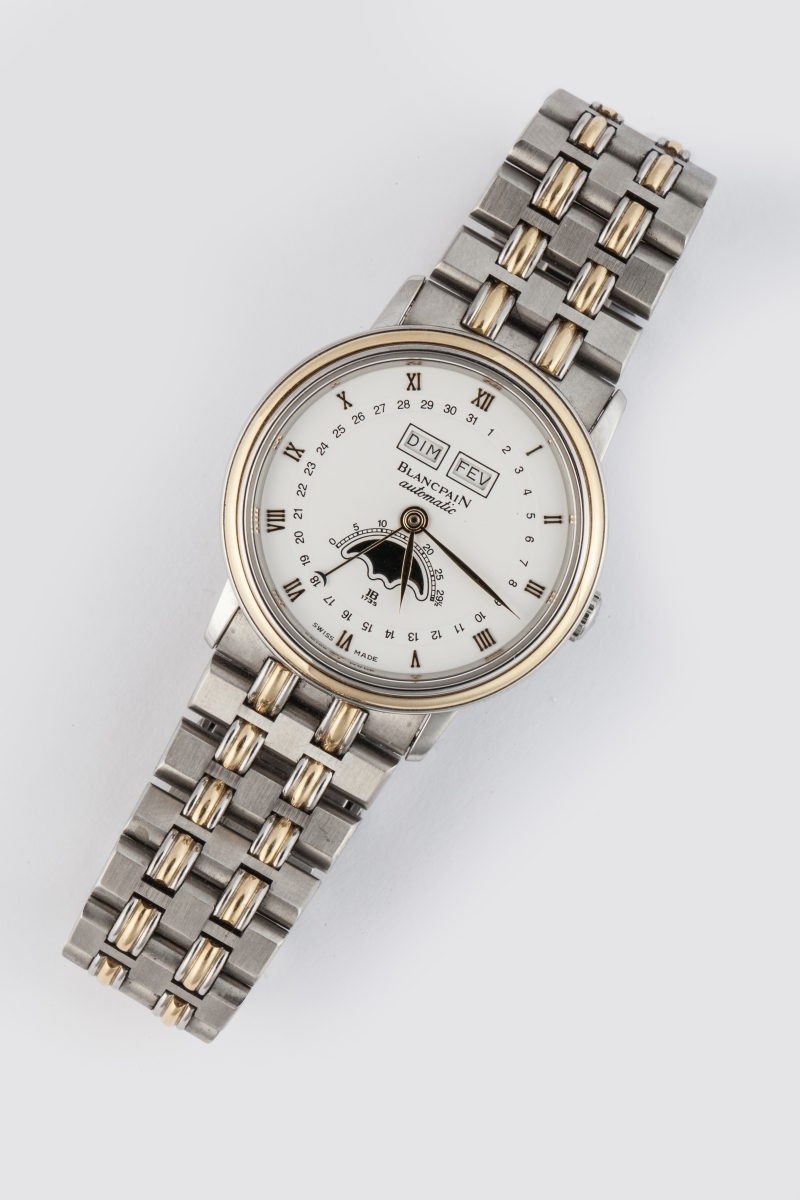 BLANCPAIN. MONTRE BRACELET À COMPLICATIONS pour homme en acier. La lunette à gradins de forme circulaire dorée. Le cadran avec les heures en chiffres romains, deux guichets à midi pour les jours de la semaine et les mois et un guichet à six heures avec le quantième de la lune. Aiguille pour la date. Mouvement automatique. Boîtier numéroté 122. Bracelet articulé en acier doré à boucle auto déployante.