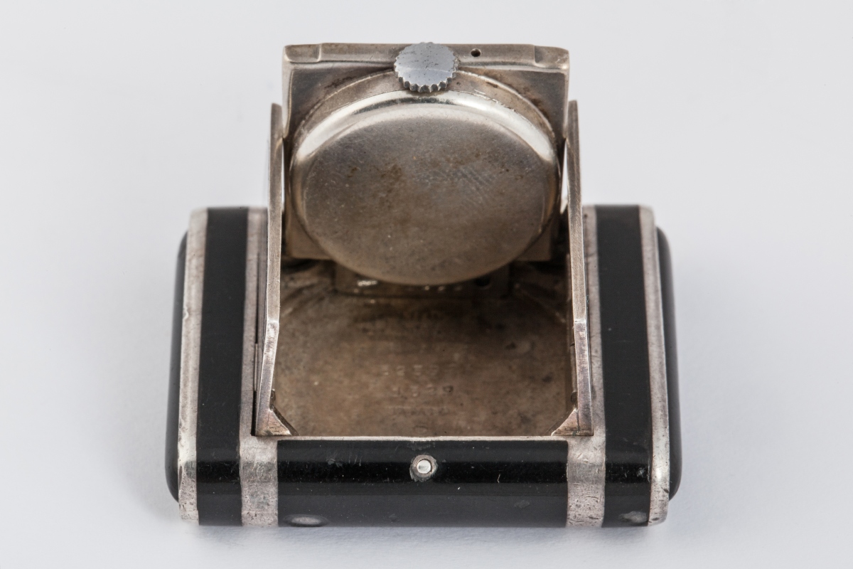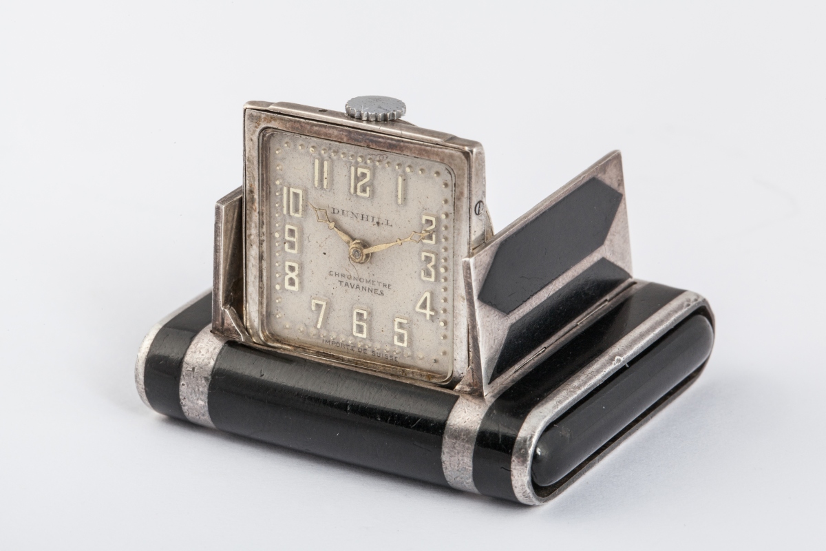 DUNHILL. PENDULETTE DE POCHE, ou de bureau, en argent et laque noire avec mécanisme escamotable par le biais des côtés poussoirs. Cadran crème à chemin de fer, chiffres arabes luminescents et aiguilles stylisées «squelette» en acier bleui, marqué "Dunhil / Chronomètre / Tavannes". Boitier signé et numéroté. Mouvement : Calibre mécanique remontage manuel numéroté.