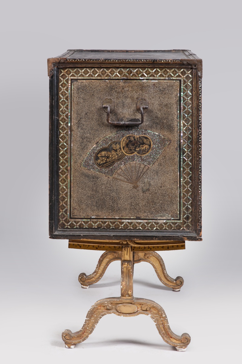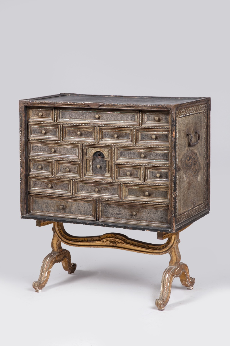 Les Portugais et les Espagnols découvrent dès le XVIe siècle ce marché très convoité qu'est le Japon, Xipangu. C'est en effet là que sont produits les meilleurs laques sur Terre. Les Japonais, alors en pleine guerre civile, donnent le nom de Nanban, c'est-à-dire "Barbares du Sud", à ce petit groupe de laques exportés par les Portugais. Si la forme de ce coffre dérive du bargueño ibérique, la technique d'incrustation de nacre sur toute la surface vient du Gujarat en Inde, la peau de raie arrive du royaume de Siam et les ferronneries sont imaginées en Europe. Le Japon apporte, lui, la technique ancestrale de ses laqueurs. Les clients finaux sont répartis à travers les mers : l'Empereur de Chine, la Cour Mongole aux Indes, l'aristocratie européenne ou les richissimes conquistadors du Nouveau Monde... Il s'agit du premier témoignage de la mondialisation de l'industrie du luxe.