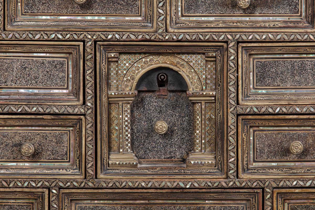 CABINET NANBAN de forme rectangulaire à décor de laque incrusté de nacre toutes faces sur âme de bois. Il ouvre en façade par 19 tiroirs de dimensions différentes sur six rangs. Chacun des tiroirs est orné, au centre, d'un laque incrusté de galuchat dans un encadrement de filets or et de plaquettes de nacre. Les moulures du cadre extérieur sont agrémentées d'entrelacs or. La structure accueillant les tiroirs reçoit quant à elle des frises feuillagées incrustées de nacre et rehaussées à l'or. Le tiroir central, muni d'une serrure, adopte une façade architecturée : arc de plein cintre reposant sur deux quarts de colonnes coiffés d'une imposte et terminés par une plinthe à degrés. Les côtés latéraux sont centrés d'un éventail à fond burgoté présentant deux registres figurant, sur fond noir, des plantes fleuries et un couple de bœufs pour l'un, et pour l'autre, un pêcher et un couple de lièvres. Ces panneaux comme le panneau arrière, sont encadrés de frises géométriques incrustées de plaquettes de nacre et de fleurons or. Ce coffre est muni de deux poignées mobiles en fer peint et, au quatre coins, ainsi qu'au centre de la traverse haute de façade, de garnitures en laiton ciselé.