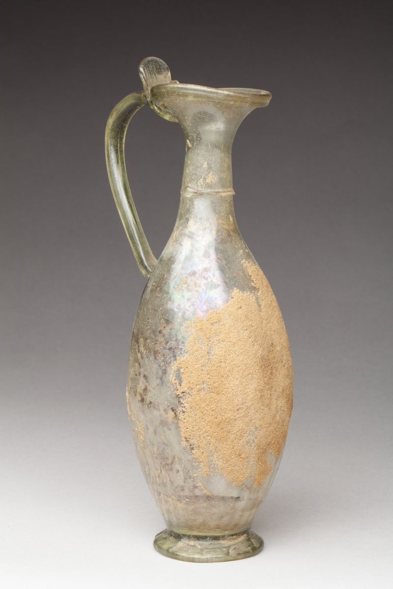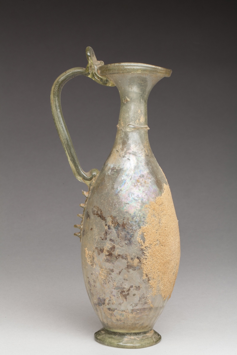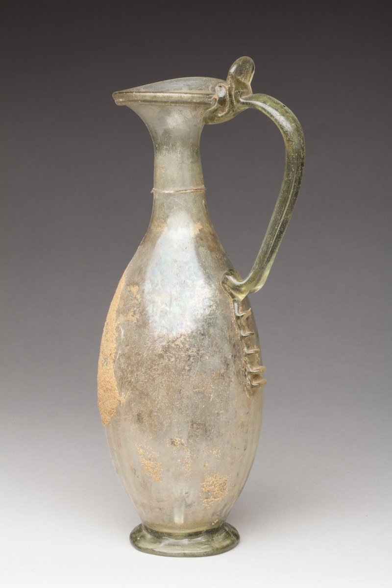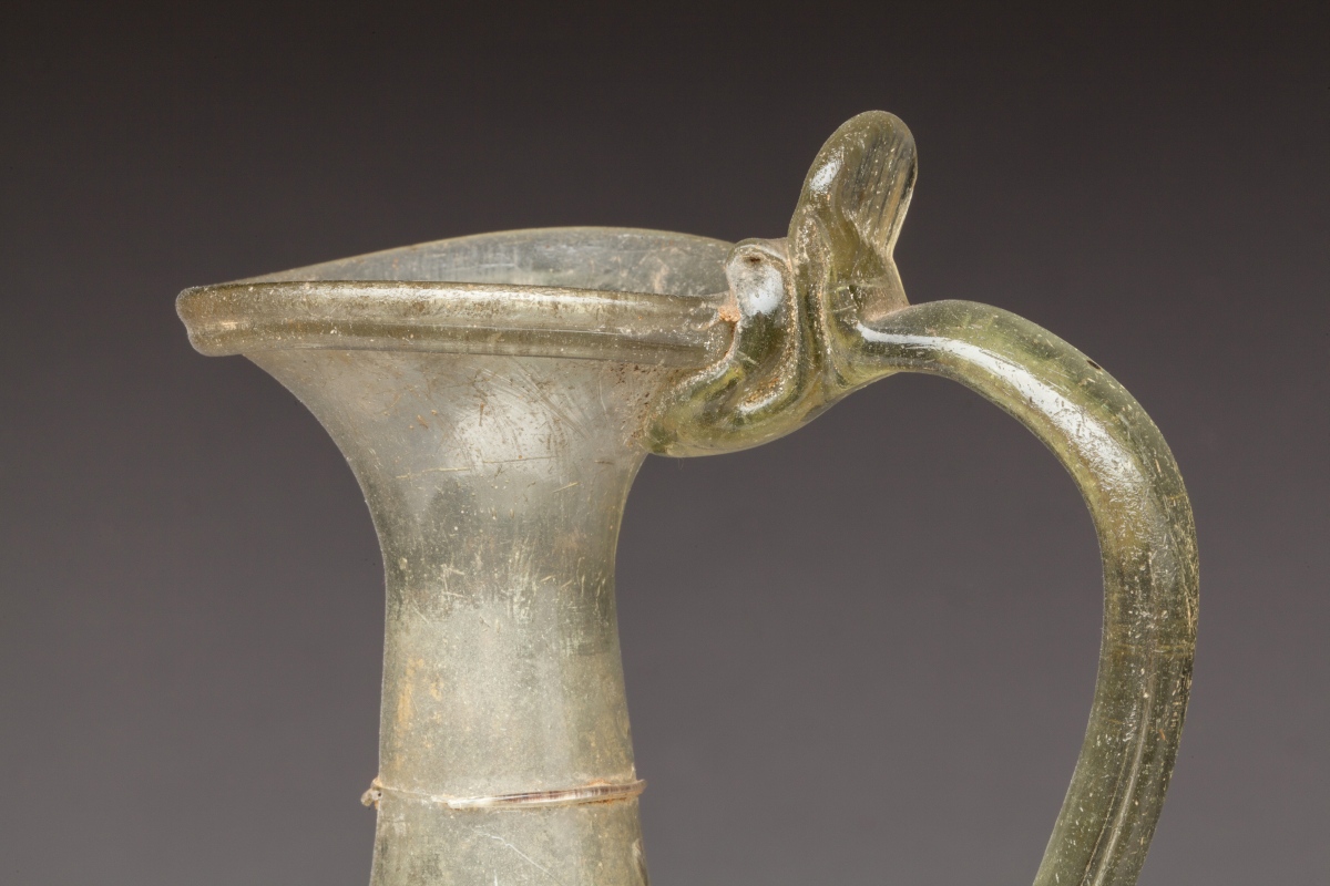 GREAT BOTTLE with a handle. Greenish glass. Gallo-Romain, 4th century A.D.