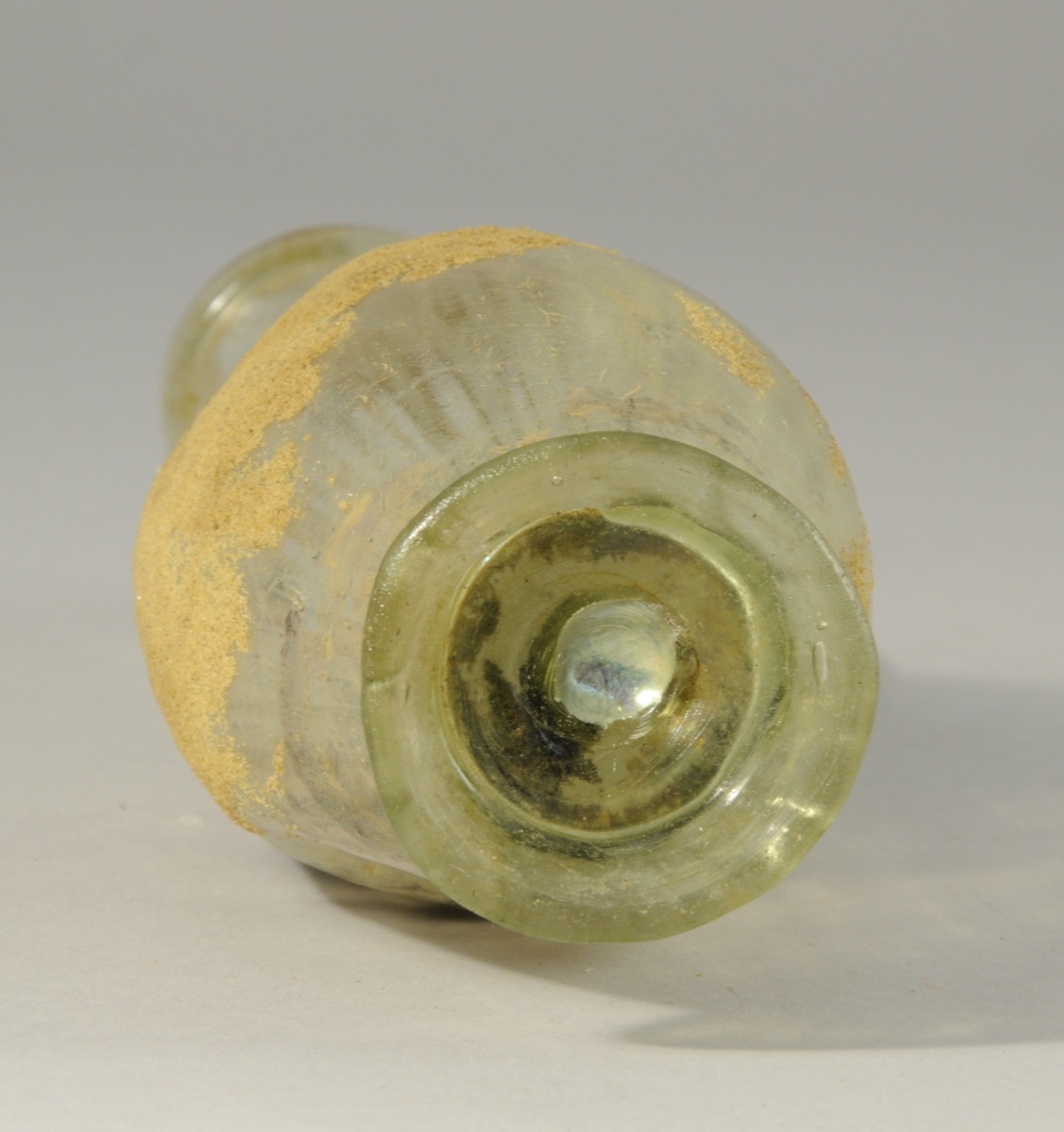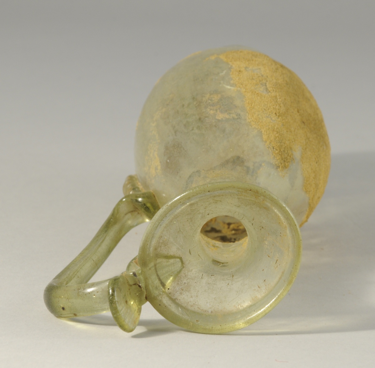GRANDE BOUTEILLE à anse sur pied. Verre verdâtre, dépôt de fouille. Anse en verre moulé avec appui pouce. (Fils de verre sur le col (très petit manque).