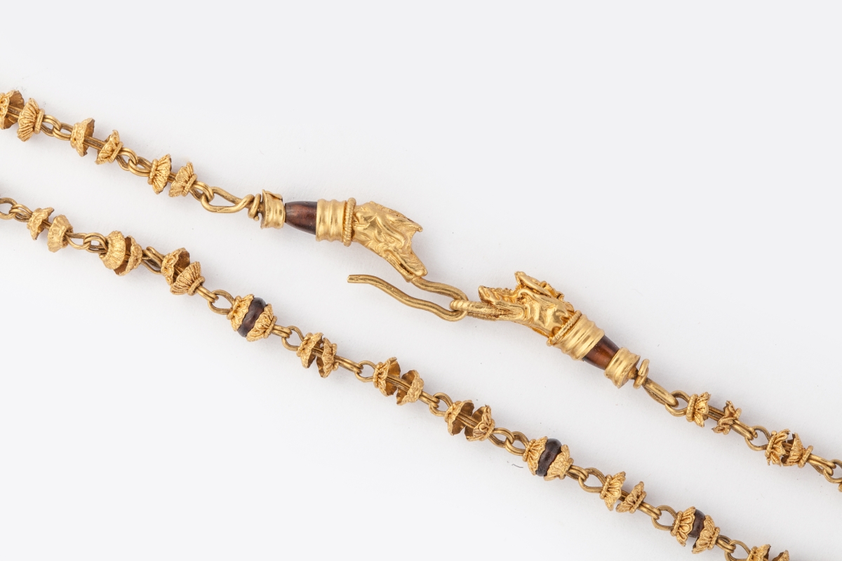 COLLIER composé de perles en or formées de deux cupules, certaines entourent une perle en pâte de verre. Le fermoir représente deux protomés d'animaux marins ?