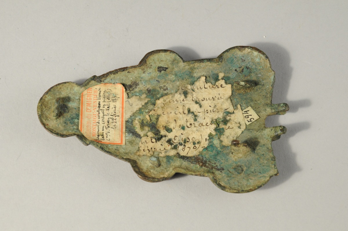 Ancienne étiquette : "collection du Dr Mignen Montaigu - Vendée. Fragment de ceinturon trouvé dans un cercueil en pierre. Cme Tracy-Le-Val (Oi...) le 22 février 193."