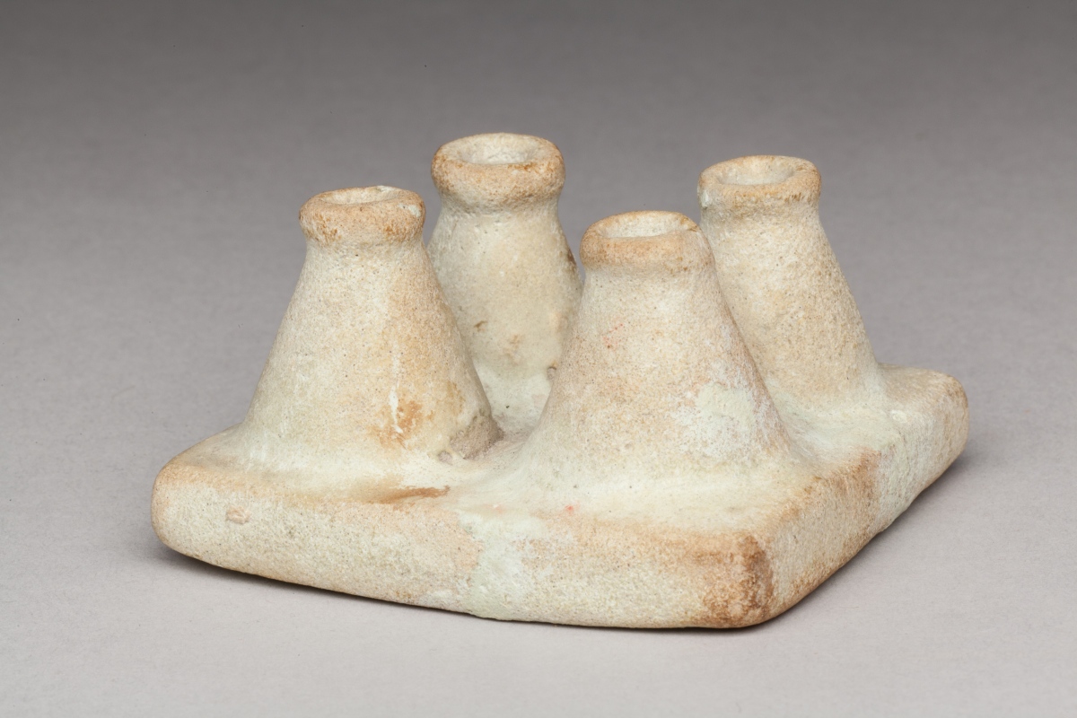 DÉPÔT DE FONDATION, ou GRENIER à GRAINES formé d'une série de quatre petits vases godets sur une base carrée. Terre cuite sans engobe.