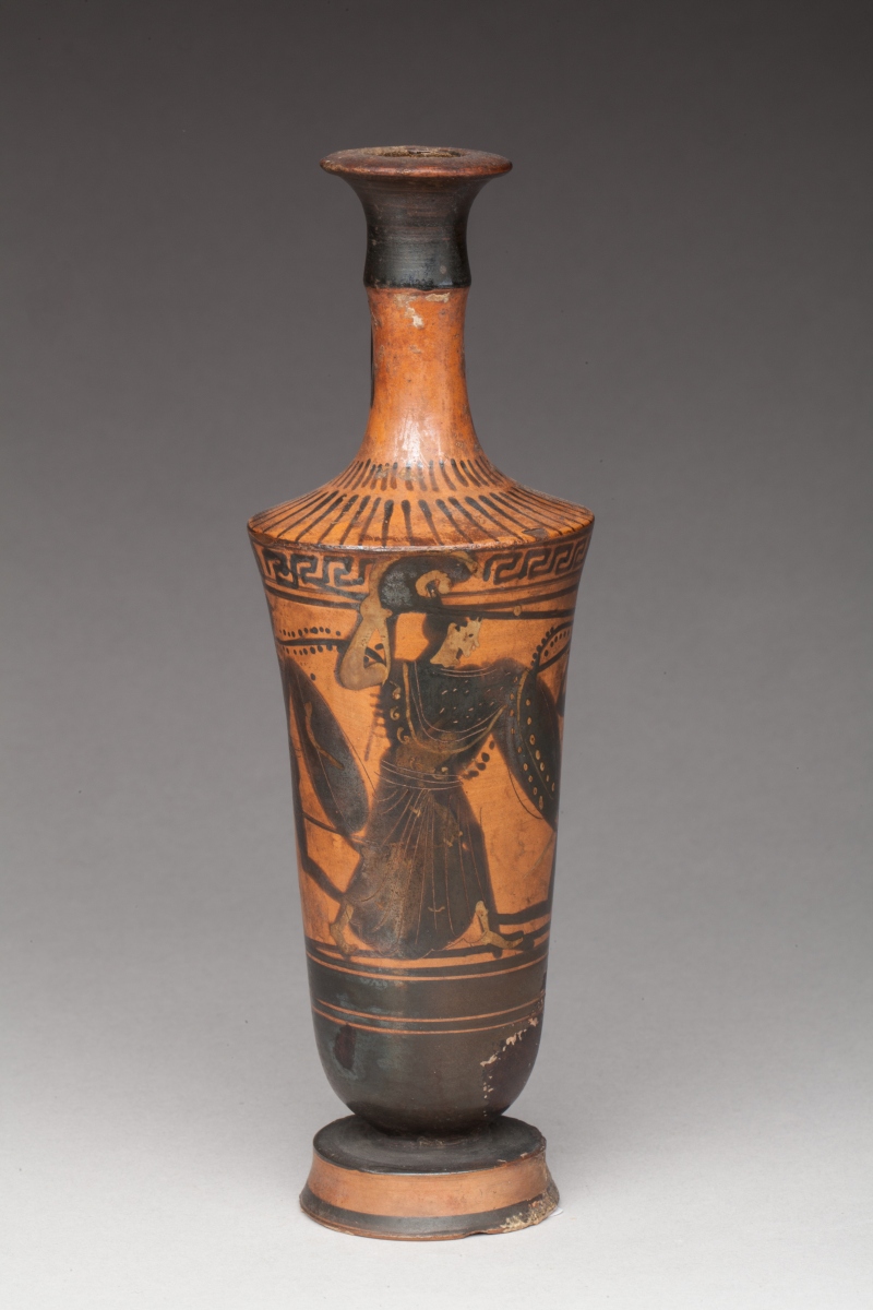LECYTHE. Céramique à figure noire. Décor de gauche à droite Hoplite en arme attaquant, au centre divinité, à droite Hoplite fléchissant, sur l'épaulement suite de couronnes verticales.