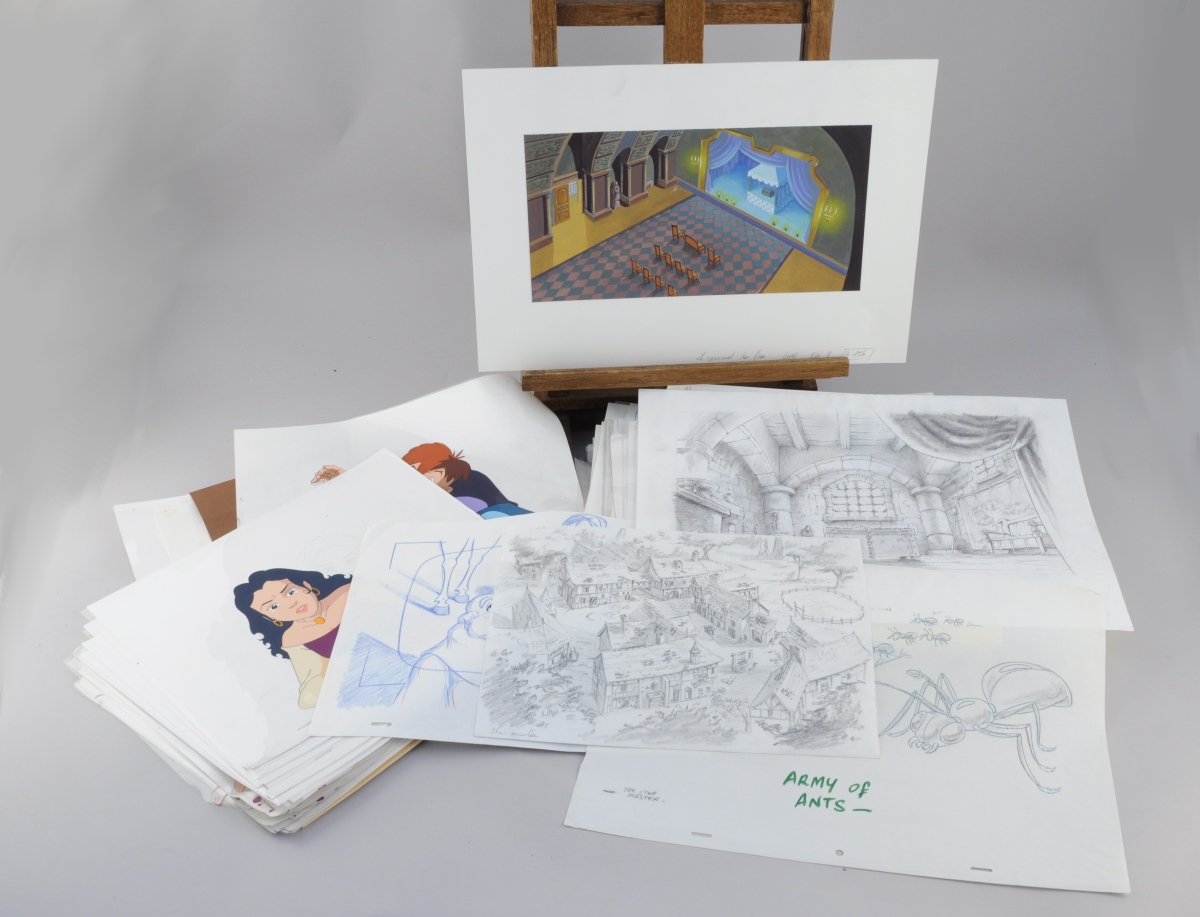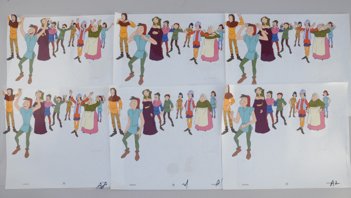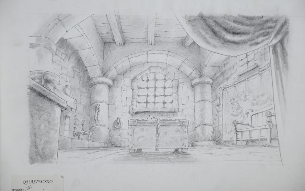 Carton des archives graphiques d'un épisode de la série de dessins animés "Quasimodo" ("The magical adventure of Quasimodo" en anglais) produite en 1995 par Ares Films, comprenant notamment : model sheet, celluloïd et background...