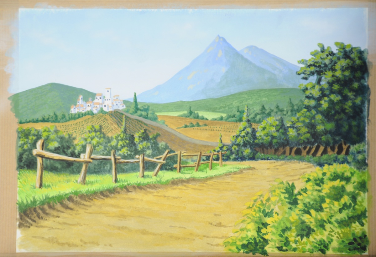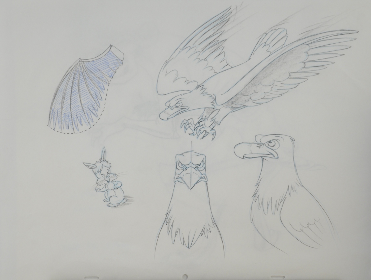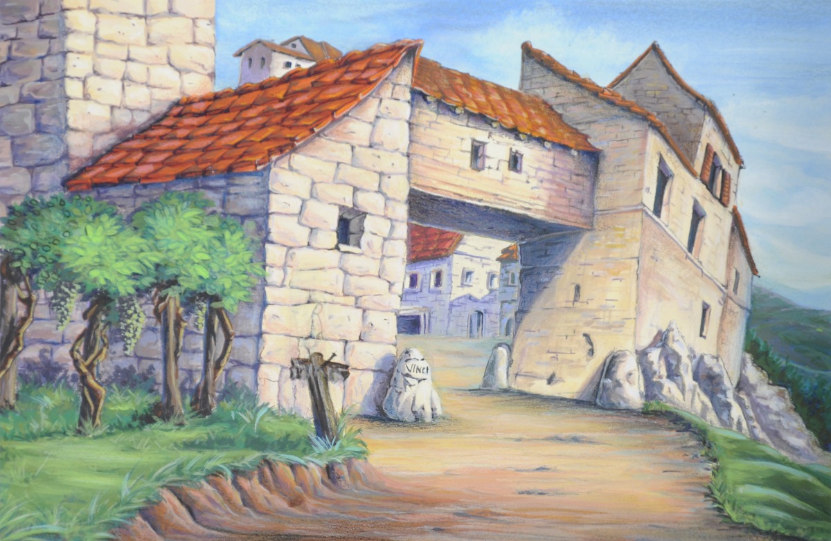 Carton des archives graphiques d'un épisode de la série de dessins animés " Quasimodo " (" The magical adventure of Quasimodo " en anglais) produite en 1995 par Ares Films, comprenant notamment : model sheet, celluloïd et background...