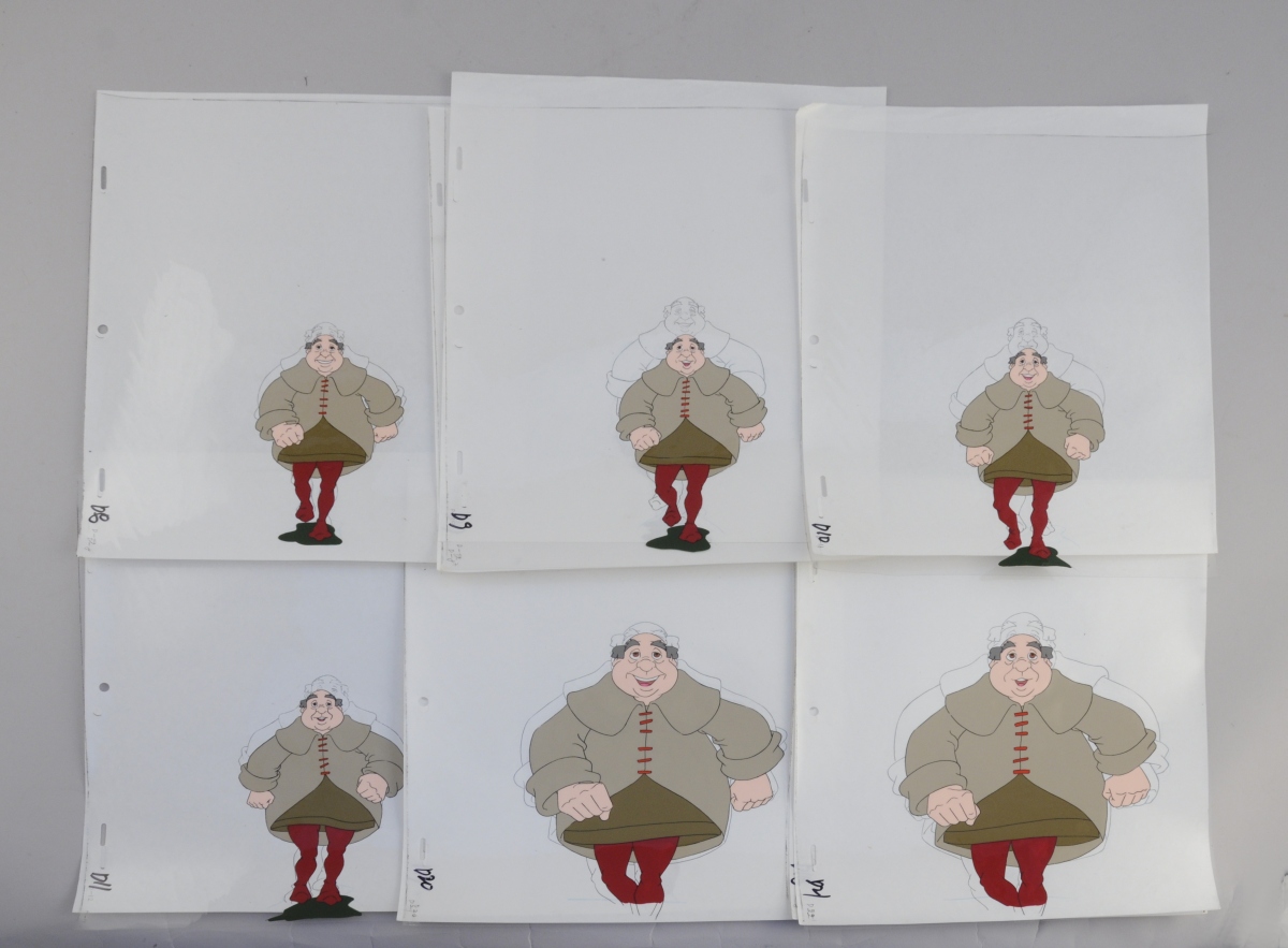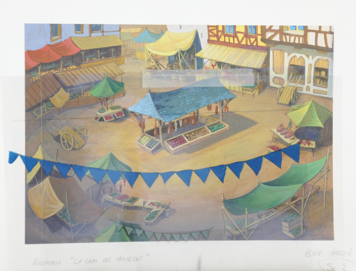 Carton des archives graphiques d'un épisode de la série de dessins animés " Quasimodo " (" The magical adventure of Quasimodo " en anglais) produite en 1995 par Ares Films, comprenant notamment : model sheet, celluloïd et background...