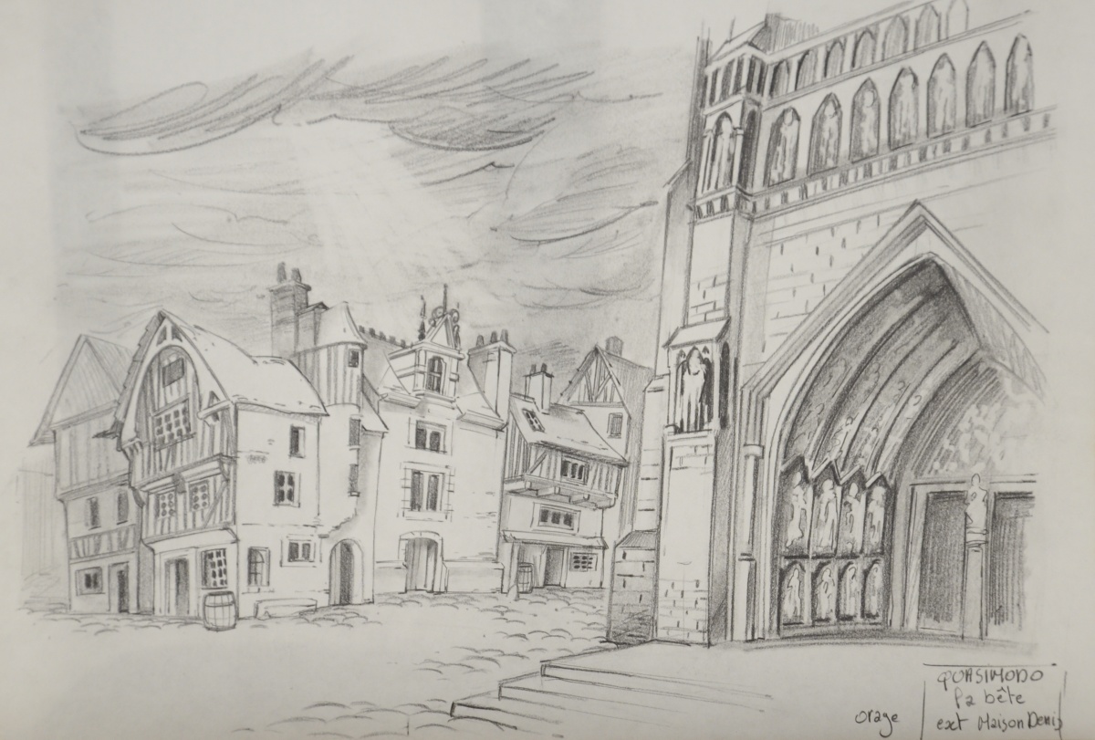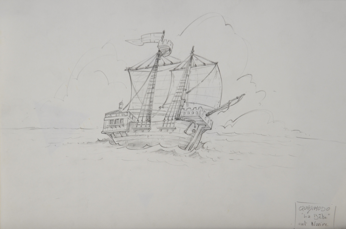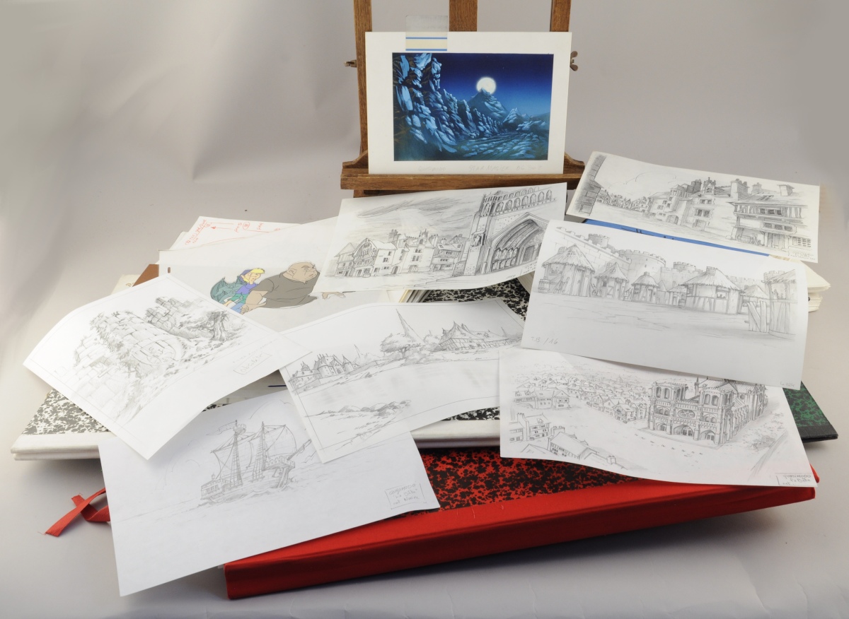 Carton des archives graphiques d'un épisode de la série de dessins animés " Quasimodo " (" The magical adventure of Quasimodo " en anglais) produite en 1995 par Ares Films, comprenant notamment : model sheet, celluloïd et background...