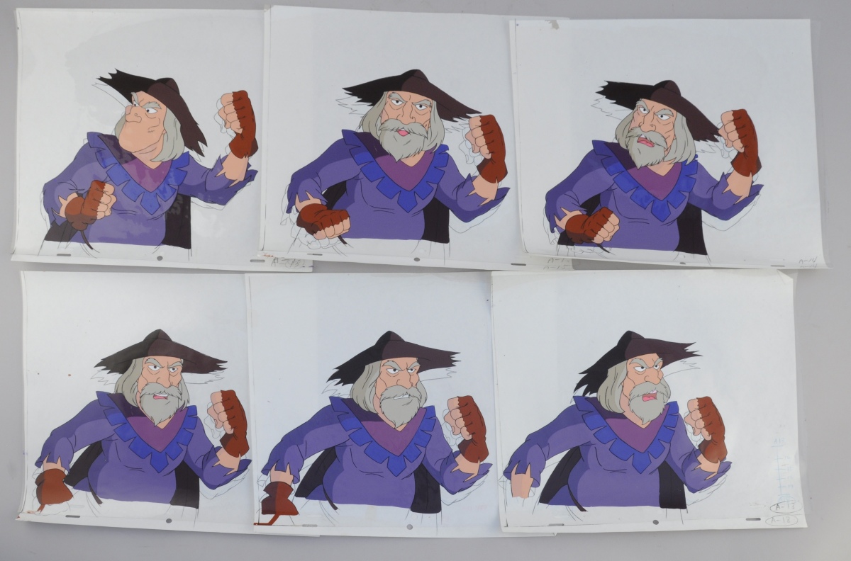 Carton des archives graphiques d'un épisode de la série de dessins animés " Quasimodo " (" The magical adventure of Quasimodo " en anglais) produite en 1995 par Ares Films, comprenant notamment : model sheet, celluloïd et background...
