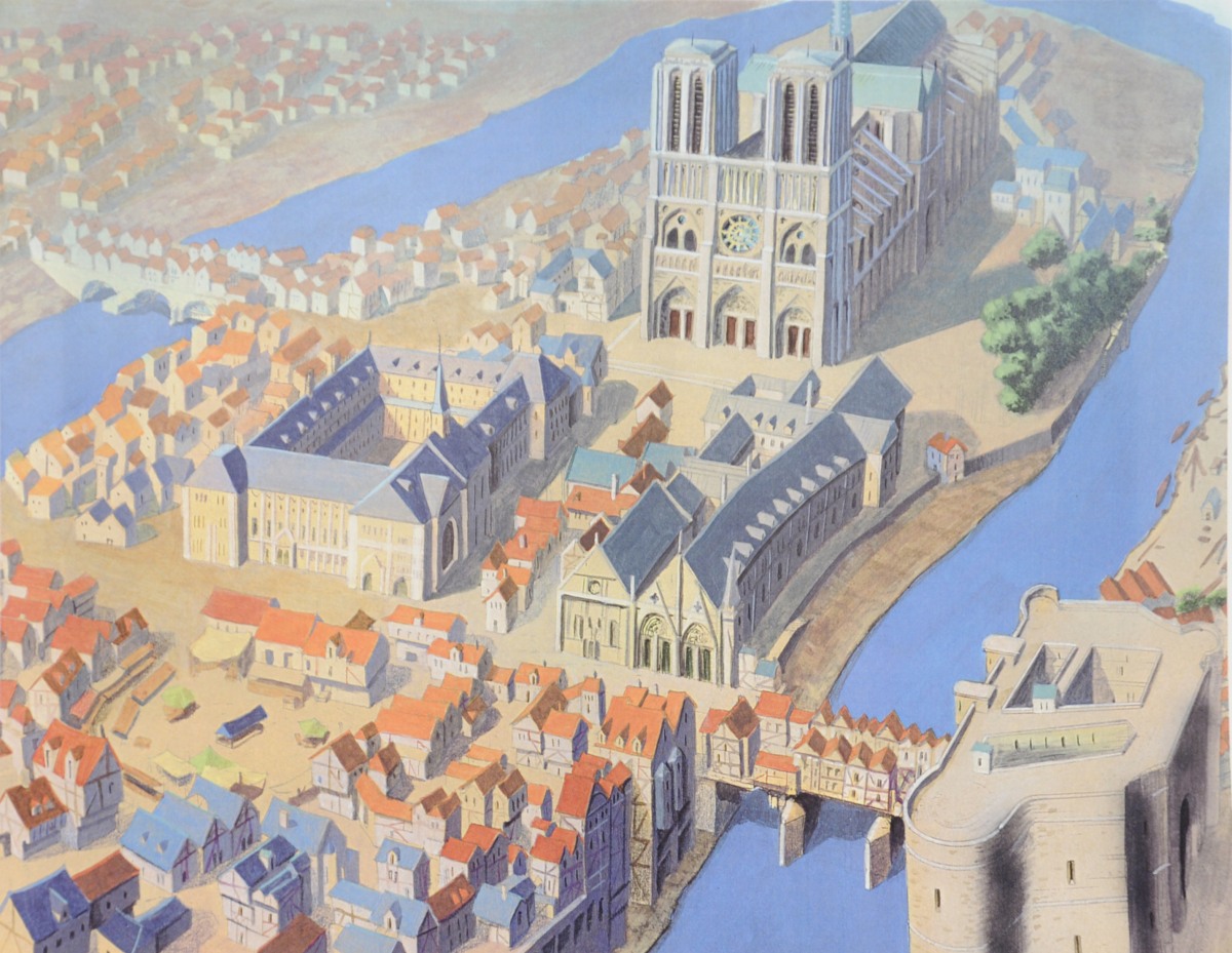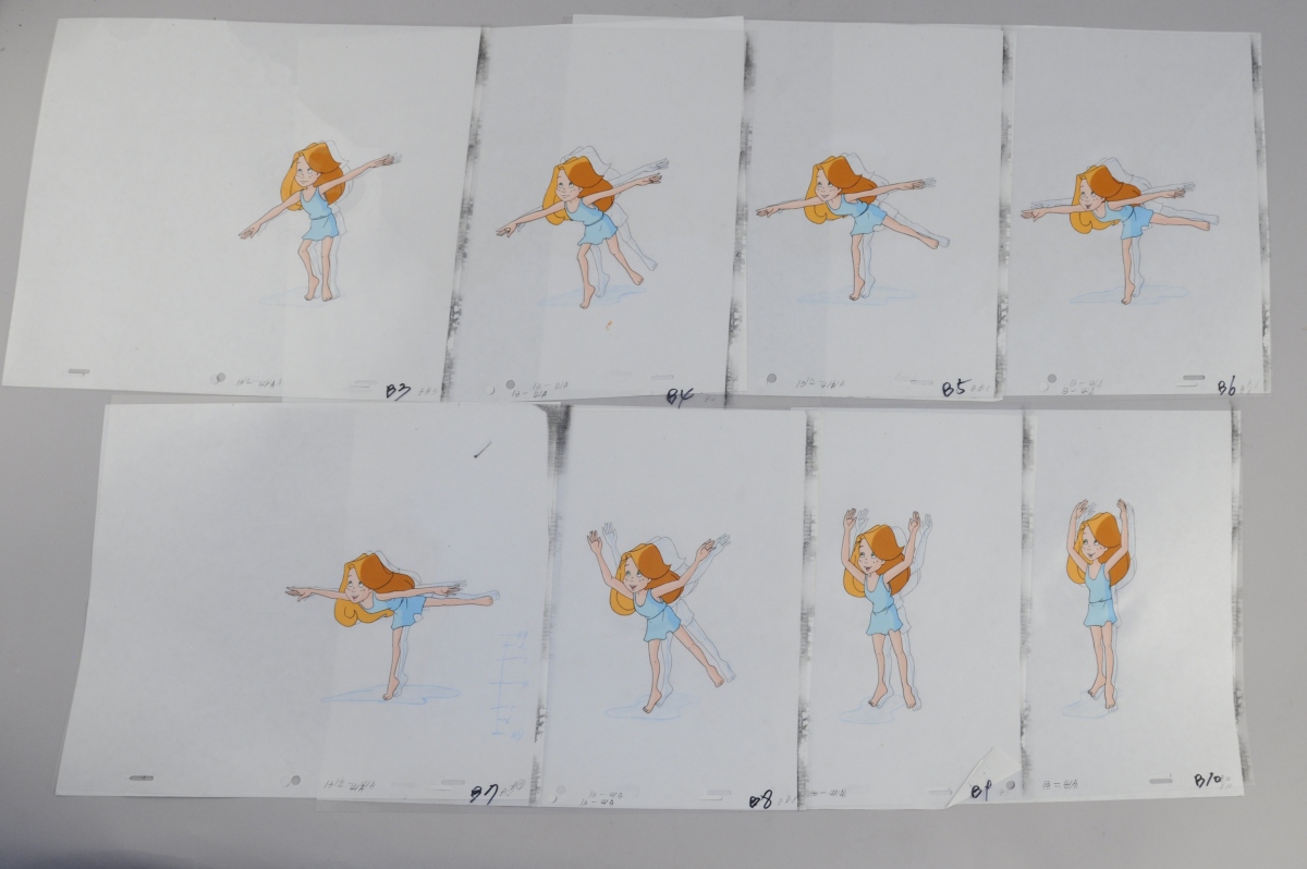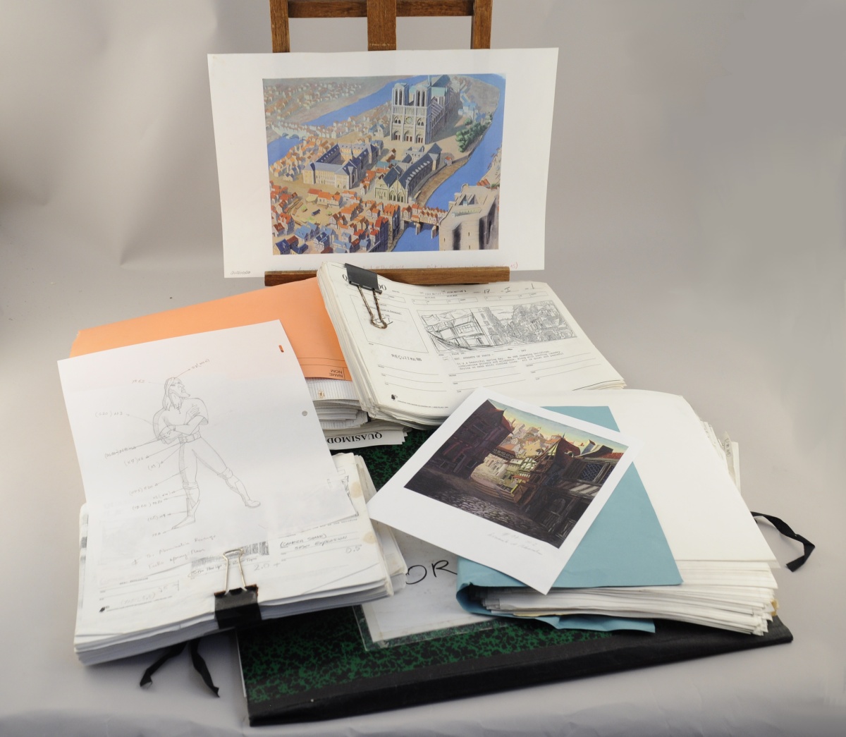Carton des archives graphiques d'un épisode de la série de dessins animés " Quasimodo " (" The magical adventure of Quasimodo " en anglais) produite en 1995 par Ares Films, comprenant notamment : model sheet, celluloïd et background...
