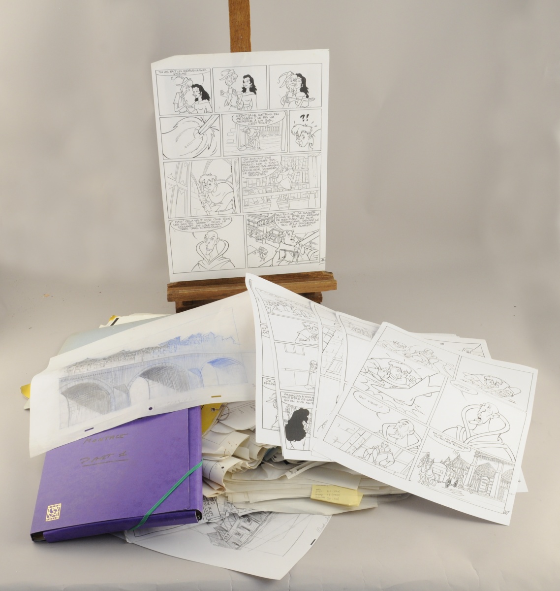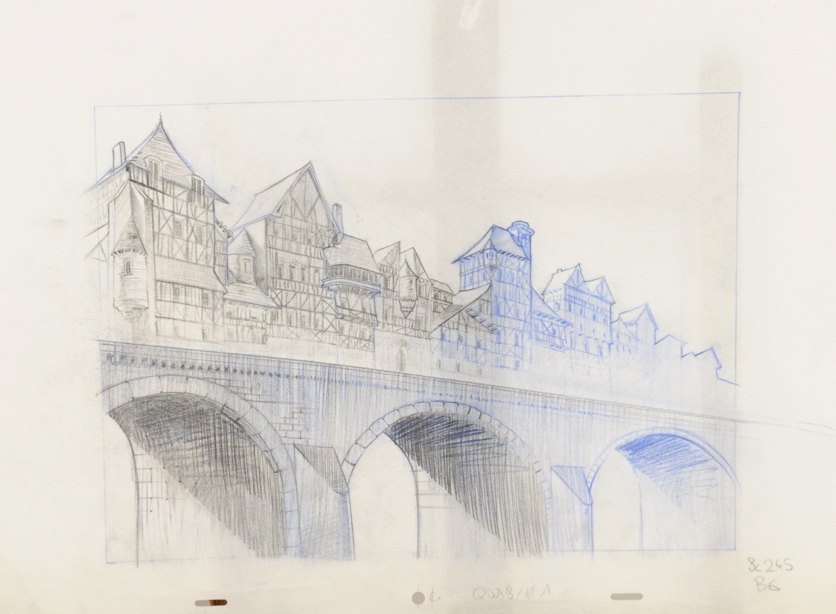 Cartons des archives graphiques du pilote de la série de dessins animés " Quasimodo " (" The magical adventure of Quasimodo " en anglais) produite en 1995 par Ares Films, comprenant notamment : model sheet, celluloïd et background, crayonnés et photos de repérage...