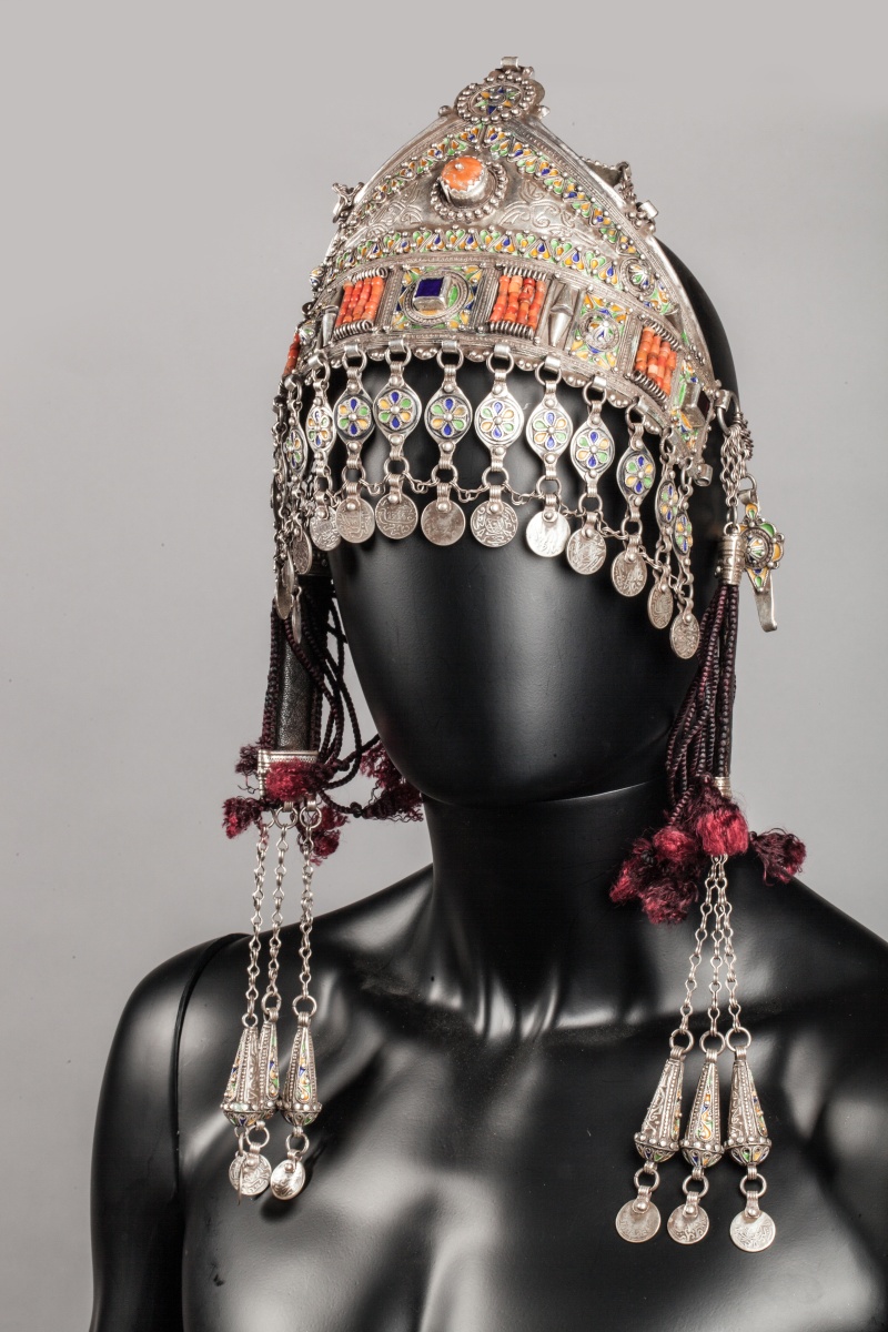 MAROC. PARURE de TÊTE en argent, corail et émail. Couronnement central surmonté d'une étoile émaillée entourée de perles en demi relief. Cabochon en corail et rais de coeur émaillé. Frise inférieure à perles en corail, pierres semi-précieuses bleues. Fuseaux sous lesquels pendent des fleurs émaillées et des pièces. Au extrémités deux longs bandeaux en cuir, cordes et fuseaux à piécettes en argent. Chainettes reliées à une monture émaillée en carré. Intérieur gainée de cuir.