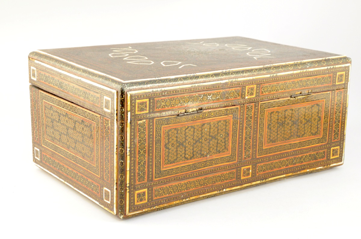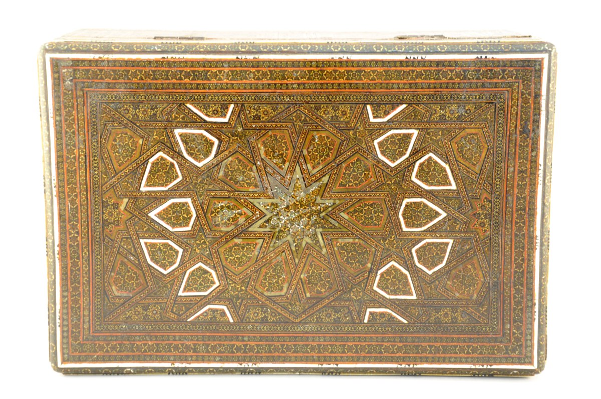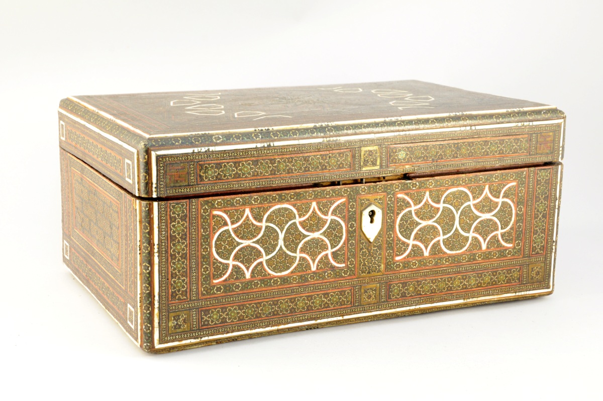 SYRIE ? COFFRET DE MARIAGE de forme rectangulaire richement marqueté toutes faces, à l'intérieur comme à l'extérieur, de motifs géométriques en laiton, ivoire, os teinté, nacre et bois précieux.