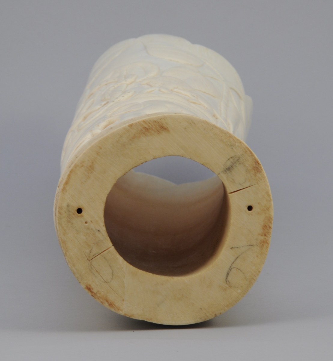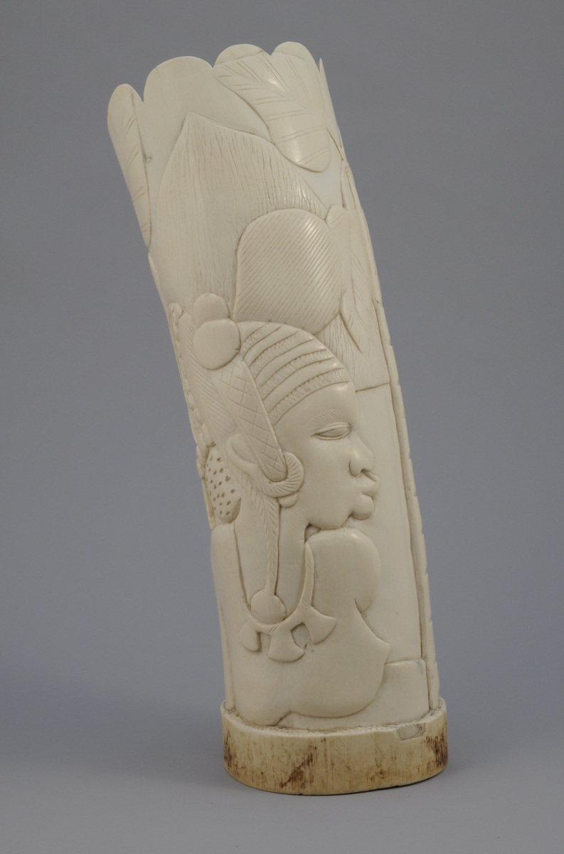 PARTIE INFÉRIEURE de DÉFENSE d'éléphant en ivoire sculptée d'un buste féminin et d'animaux de la brousse.