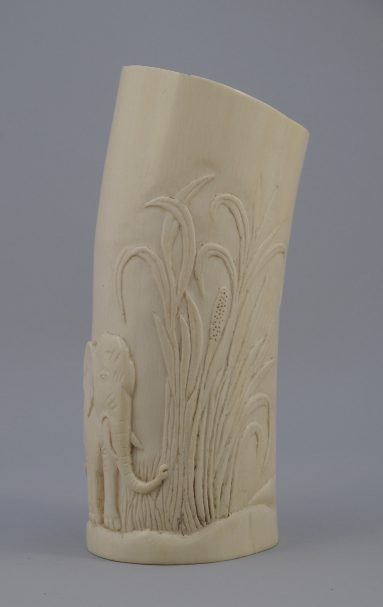 PARTIE INFÉRIEURE de DÉFENSE d'éléphant en ivoire sculptée d'éléphants et de roseaux.