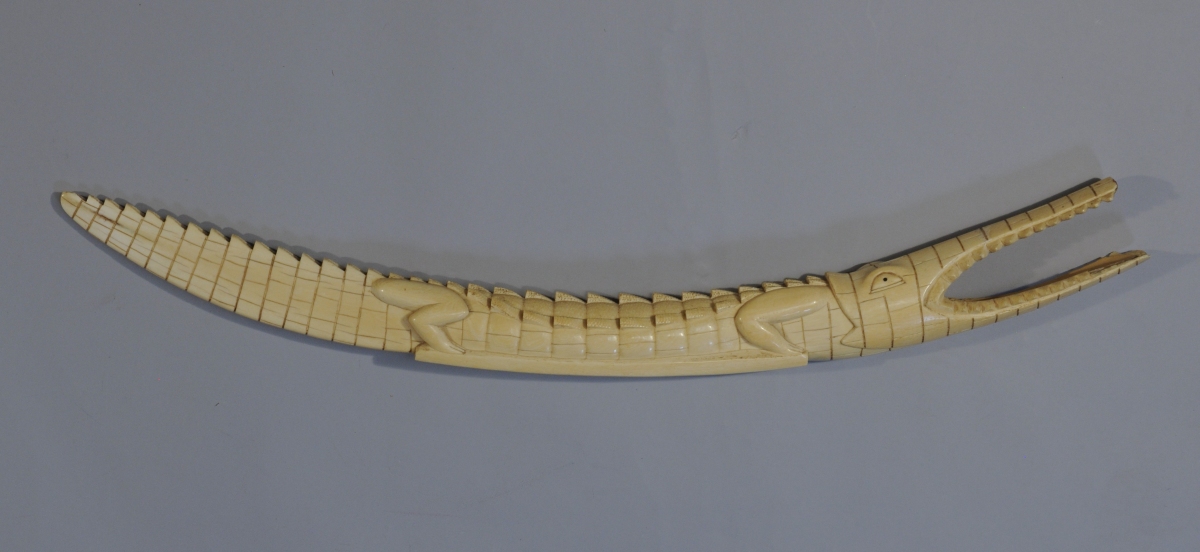 DÉFENSE d'éléphant en ivoire sculptée en crocodile. Longueur sur la...