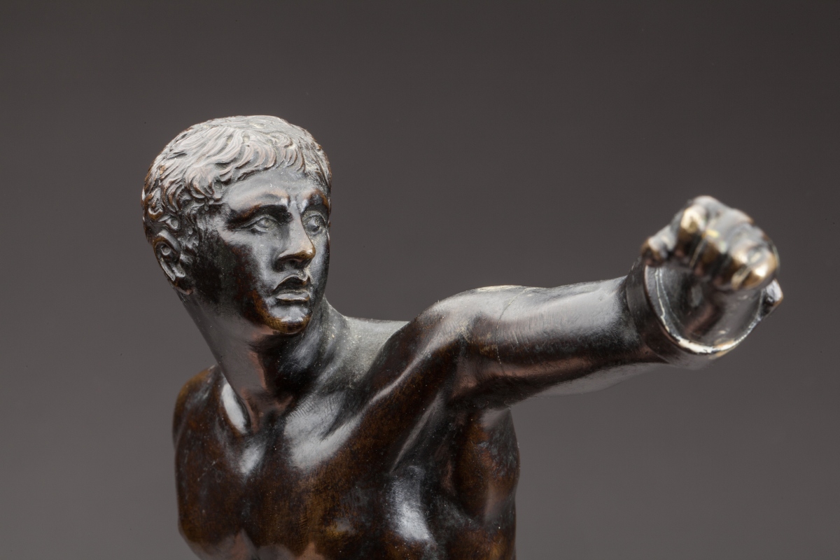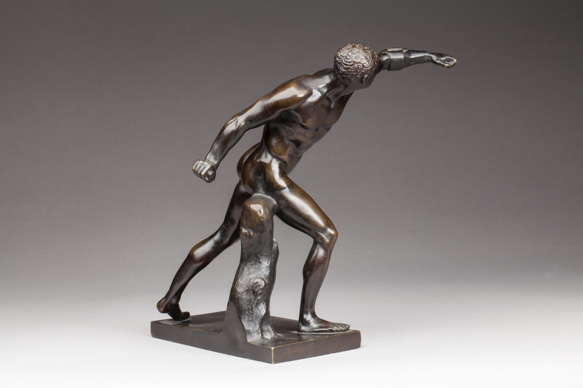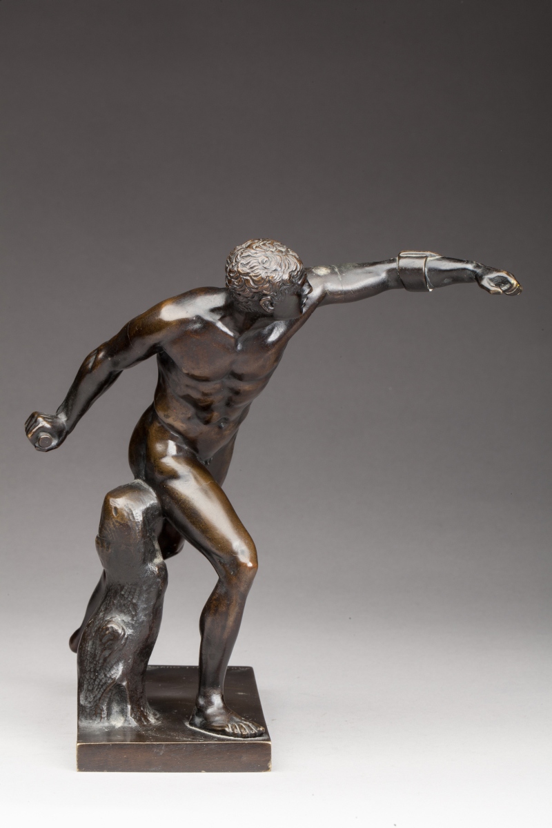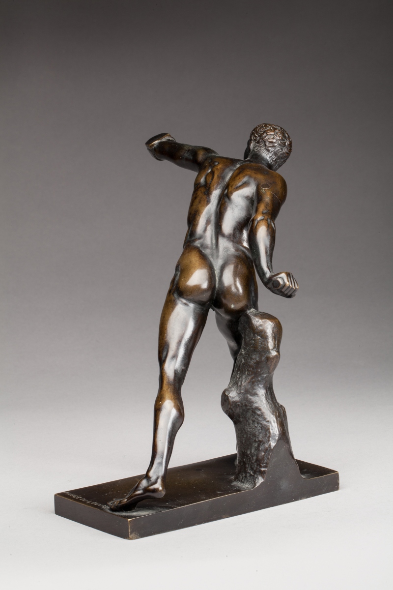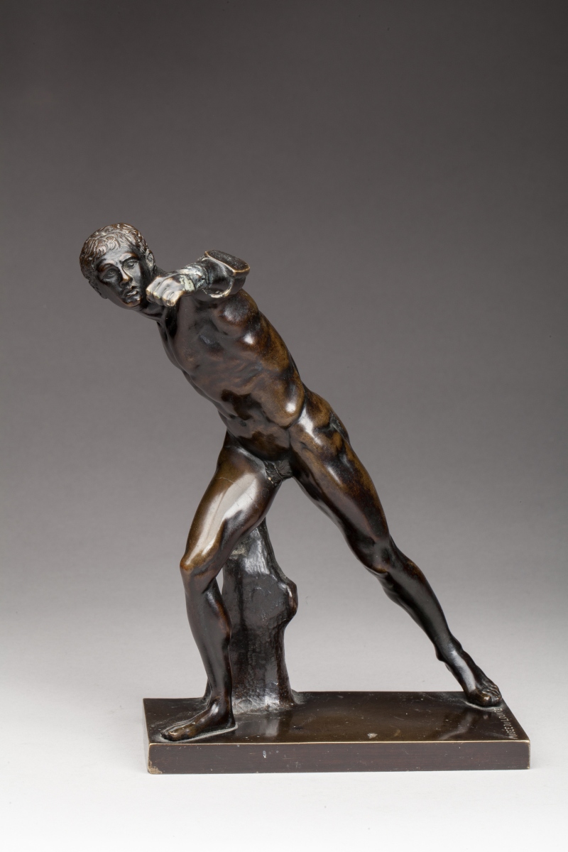 L'original de "cet objet fit partie de la collection des petits bronzes du roi Louis XIV. Il fut peut-être donné au roi en 1693 par André Le Nôtre, le jardinier de Versailles. Cette statuette, sans doute fondue dans latelier florentin de Gian Francesco Susini, copie en la réduisant considérablement une des sculptures antiques les plus célèbres au XVIIe siècle : le "Gladiateur Borghèse". Aujourdhui conservée au musée du Louvre, cette figure monumentale de héros combattant, découverte au début du XVIIe siècle en Italie, porte en lettres grecques la signature du sculpteur qui exerçait son art vers lan 100 avant notre ère".